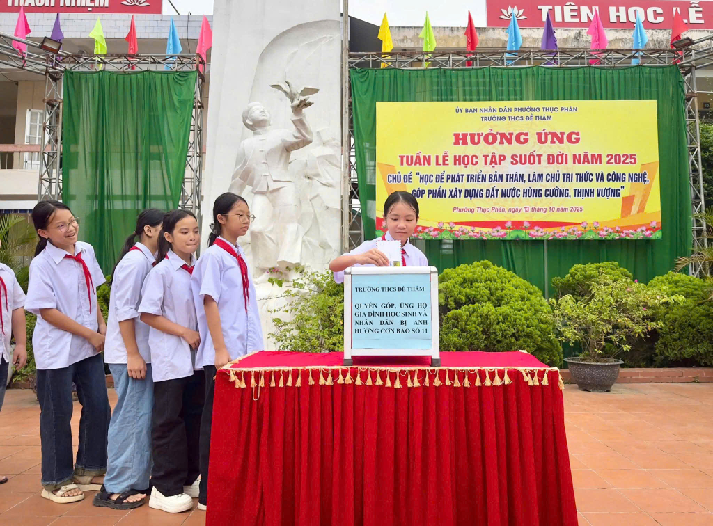 Học sinh Trường THCS Đề Thám quyên góp ủng hộ các gia đình, học sinh và nhân dân bị ảnh hưởng do mưa lũ.