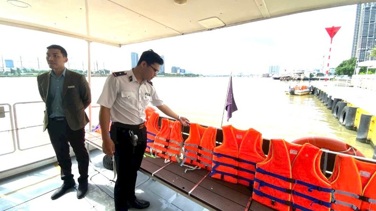 Lực lượng chức năng kiểm tra các quy định an toàn trên phương tiện giao thông đường thủy nội địa (ảnh: QUÝ HIỀN)