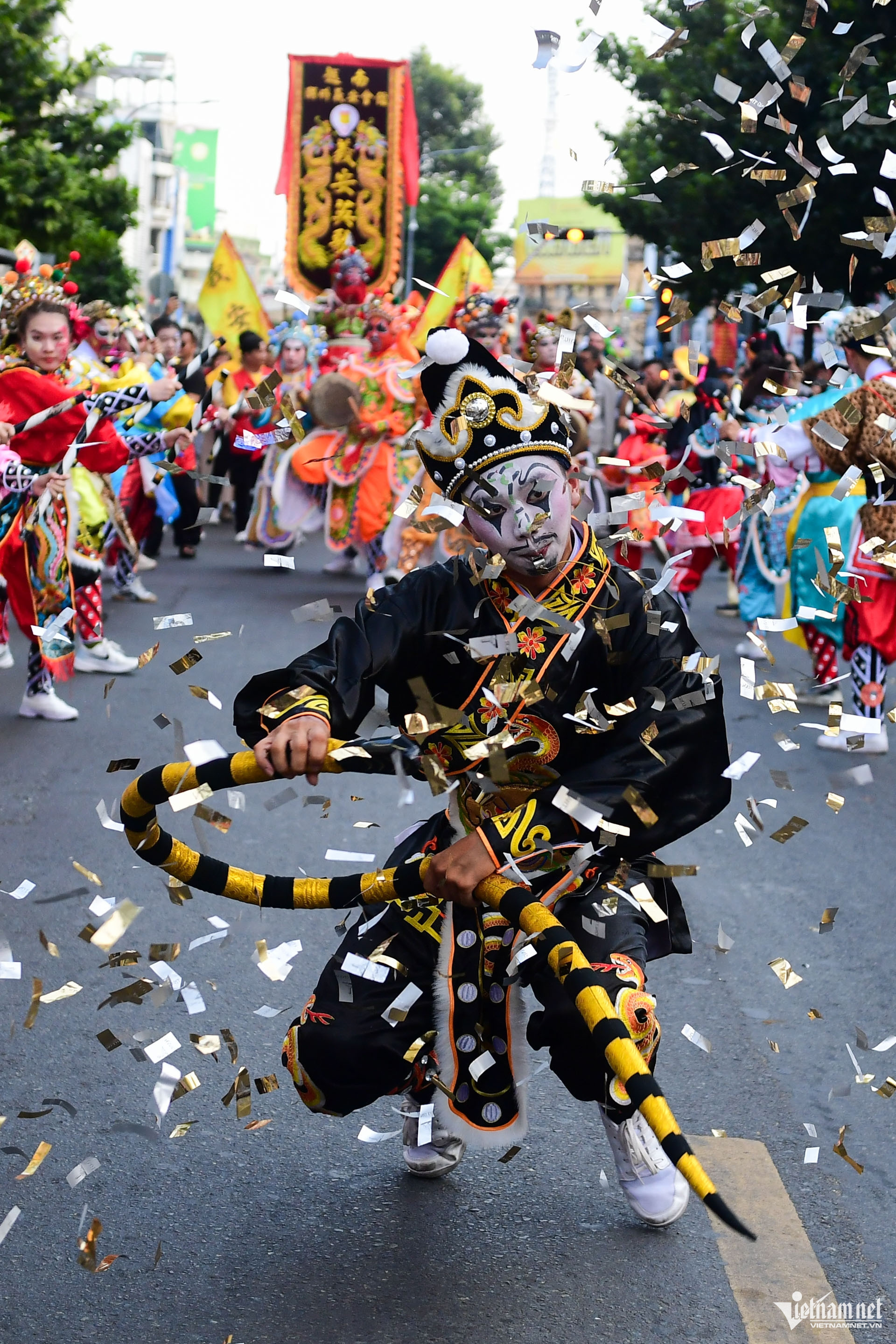 Em Trần Gia Học hóa trang thành Thần Tài dẫn đầu lễ diễu hành, theo sau là 6 vị tướng quân. "Đây là năm thứ 5 em đảm nhận vai này, em thấy vui và ý nghĩa", Gia Học chia sẻ.