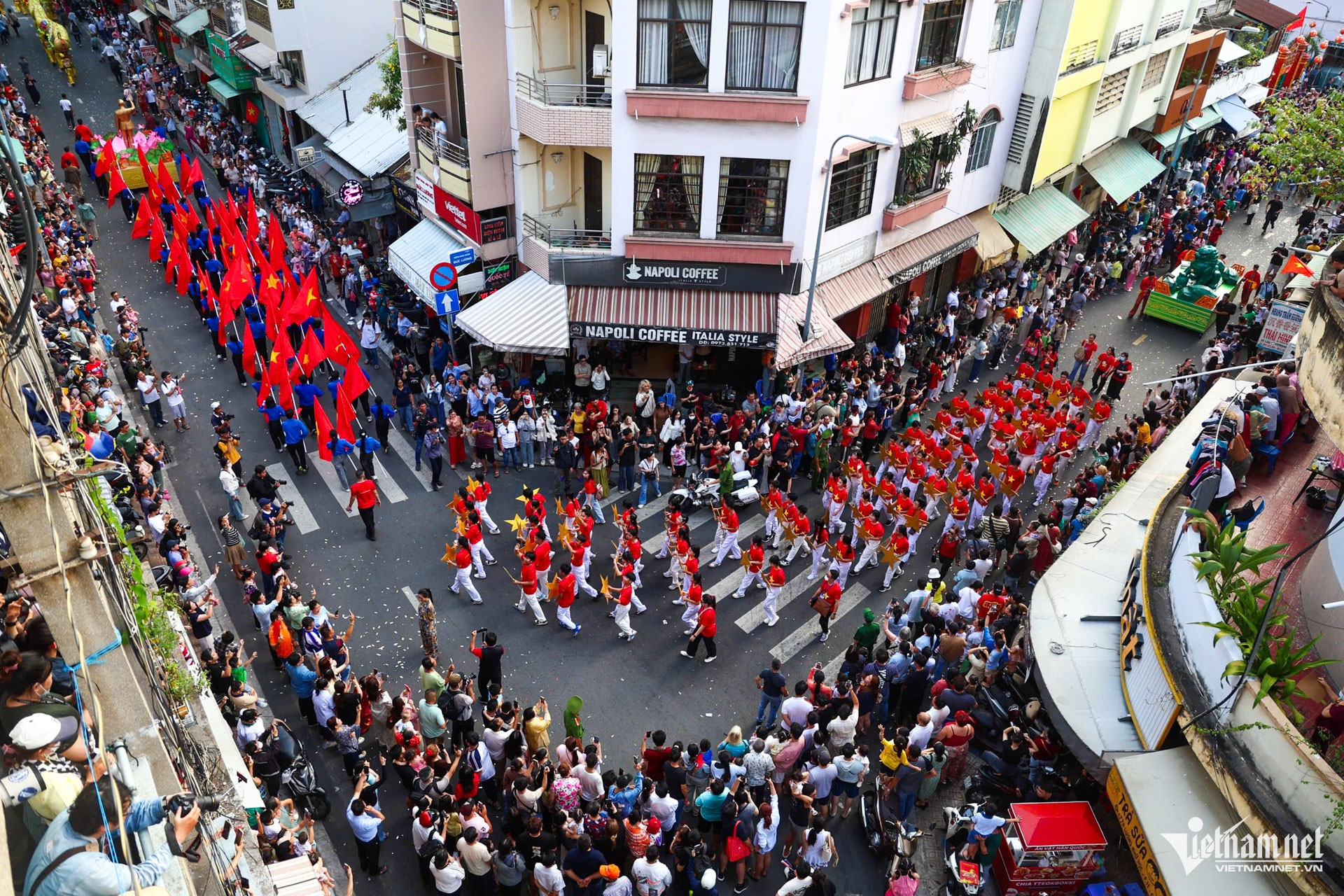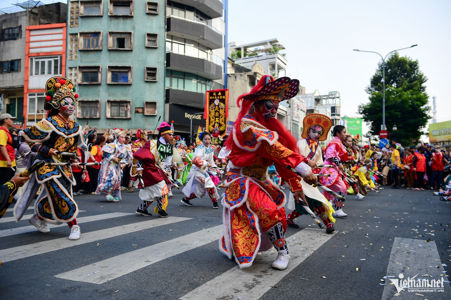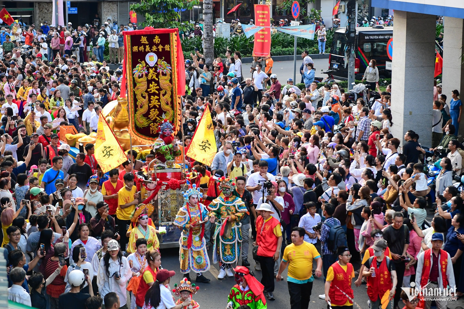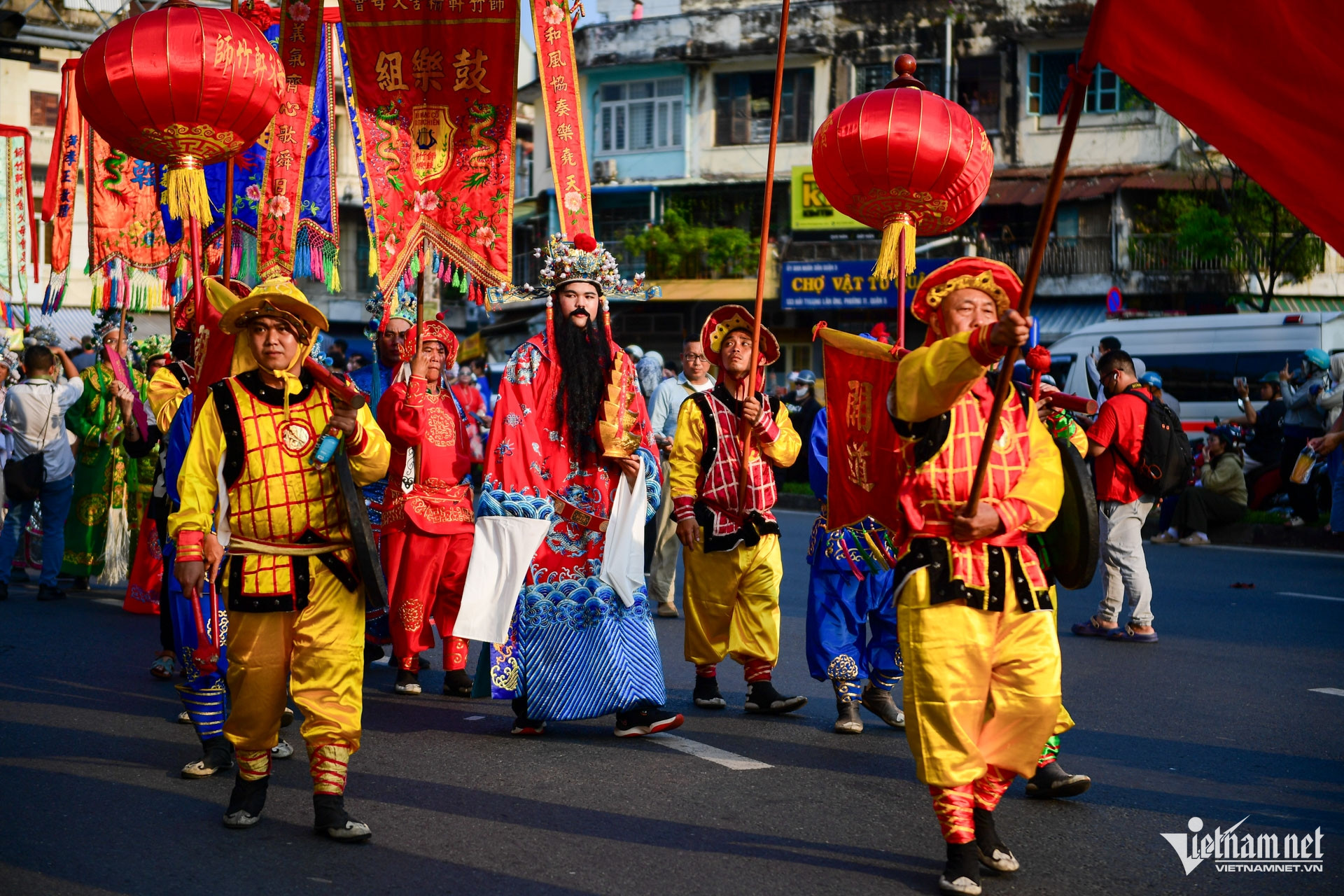 Hình ảnh đoàn diễu hành ngang qua Hội quán Ôn Lăng trên đường Lão Tử, công trình hơn trăm năm tuổi, ghi dấu ấn cộng đồng người Hoa tại Sài Gòn - Chợ Lớn.