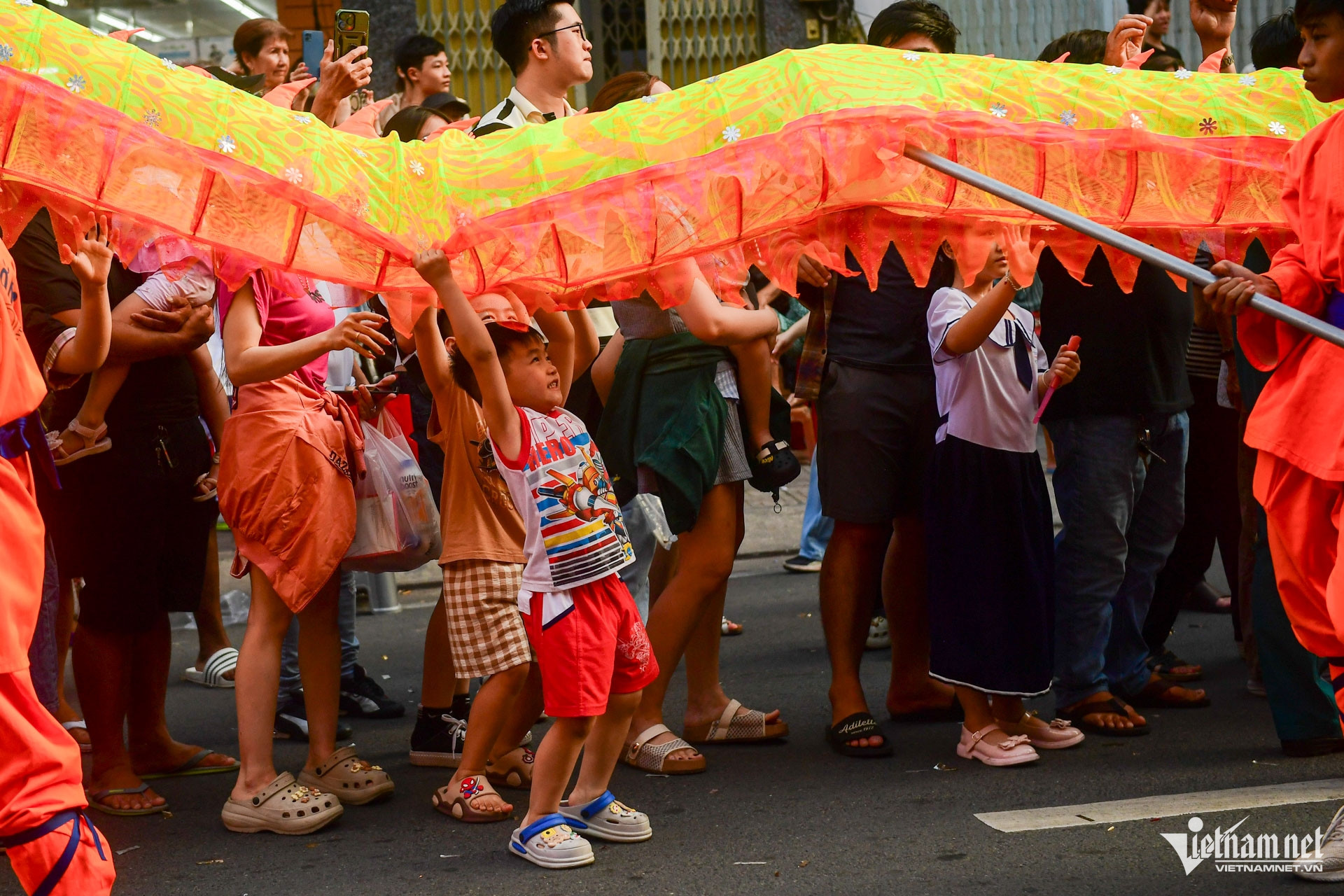 Đoàn diễu hành đi đến đâu cũng thu hút đông đảo người dân đứng hai bên đường hào hứng đón xem. Năm nào, anh Vĩnh Phú (phường Minh Phụng) cũng đưa các con đi xem hội.