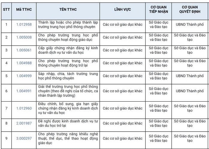 Theo đó, danh mục 109 thủ tục hành chính thuộc thẩm quyền tiếp nhận của Sở GD-ĐT thành phố như: thành lập hoặc cho phép thành lập trường THPT chuyên; sáp nhập, chia, tách trường THPT chuyên; chia, tách, sáp nhập trung tâm giáo dục nghề nghiệp, trường trung cấp tư thục trên địa bàn tỉnh, thành phố trực thuộc Trung ương…