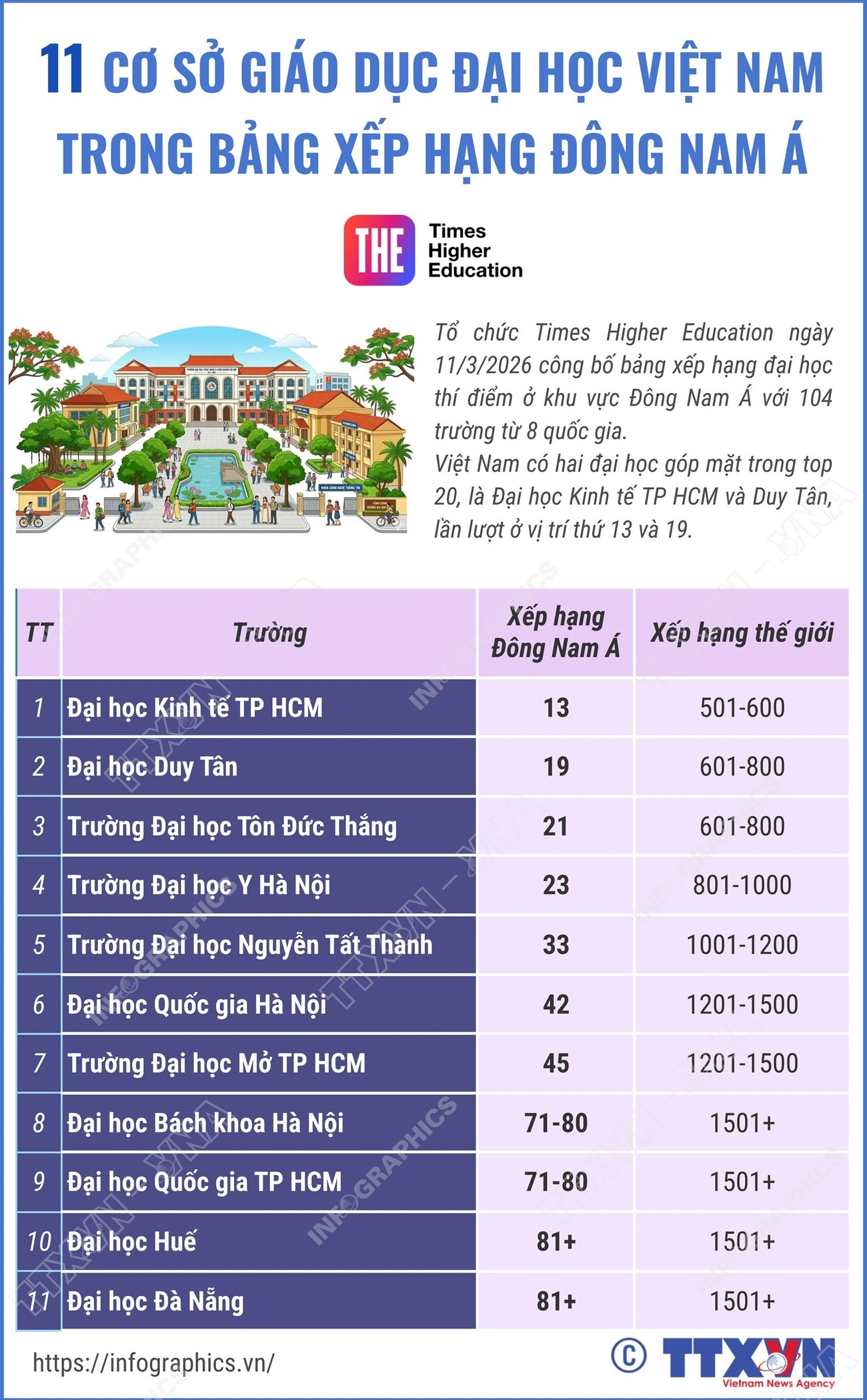 Nguồn VietnamPlus : https://www.vietnamplus.vn/11-co-so-giao-duc-dai-hoc-viet-nam-vao-bang-xep-hang-dong-nam-a-post1098623.vnp