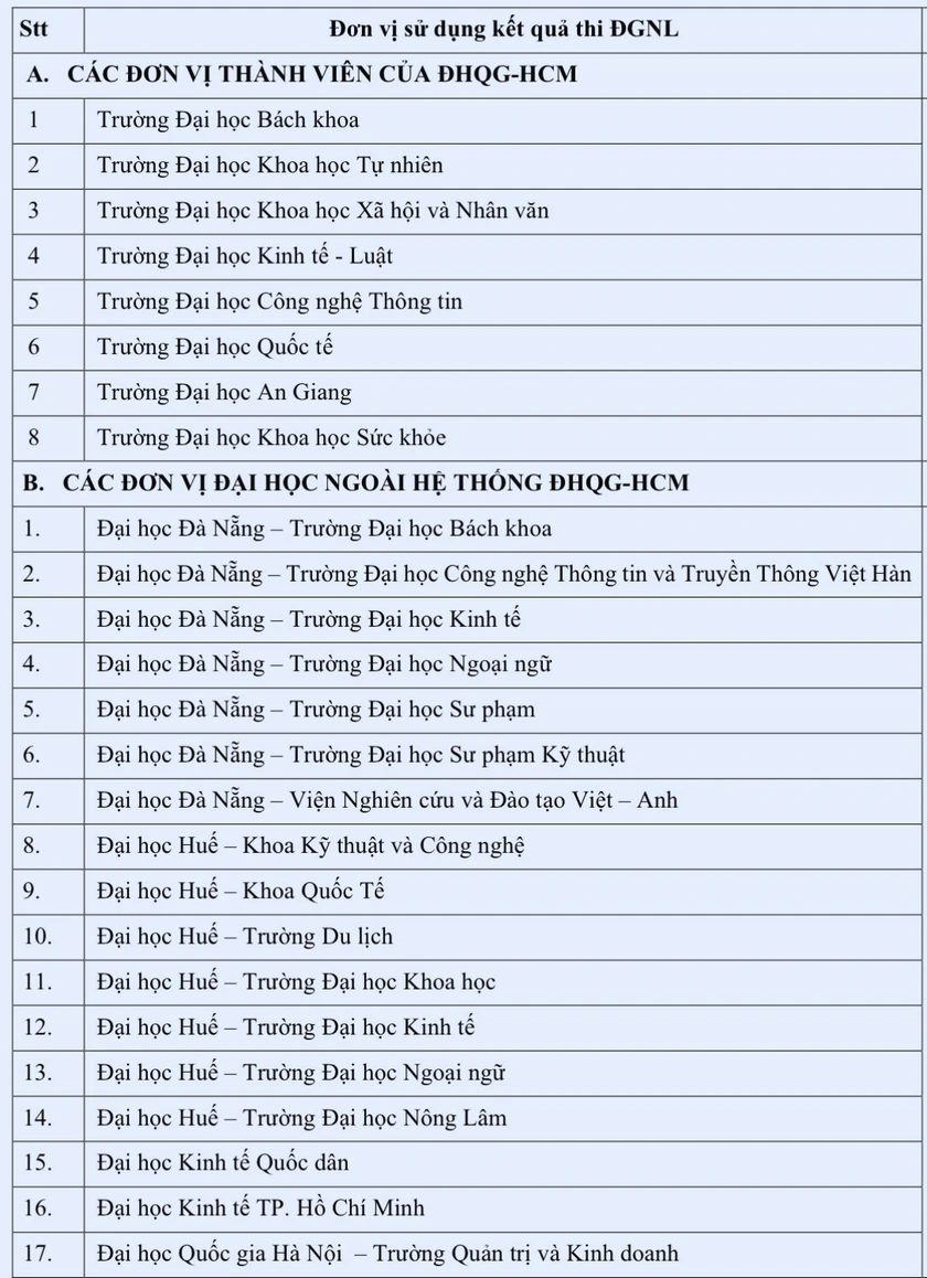 112 trường xét điểm thi đánh giá năng lực của Đại học Quốc gia Thành phố Hồ Chí Minh