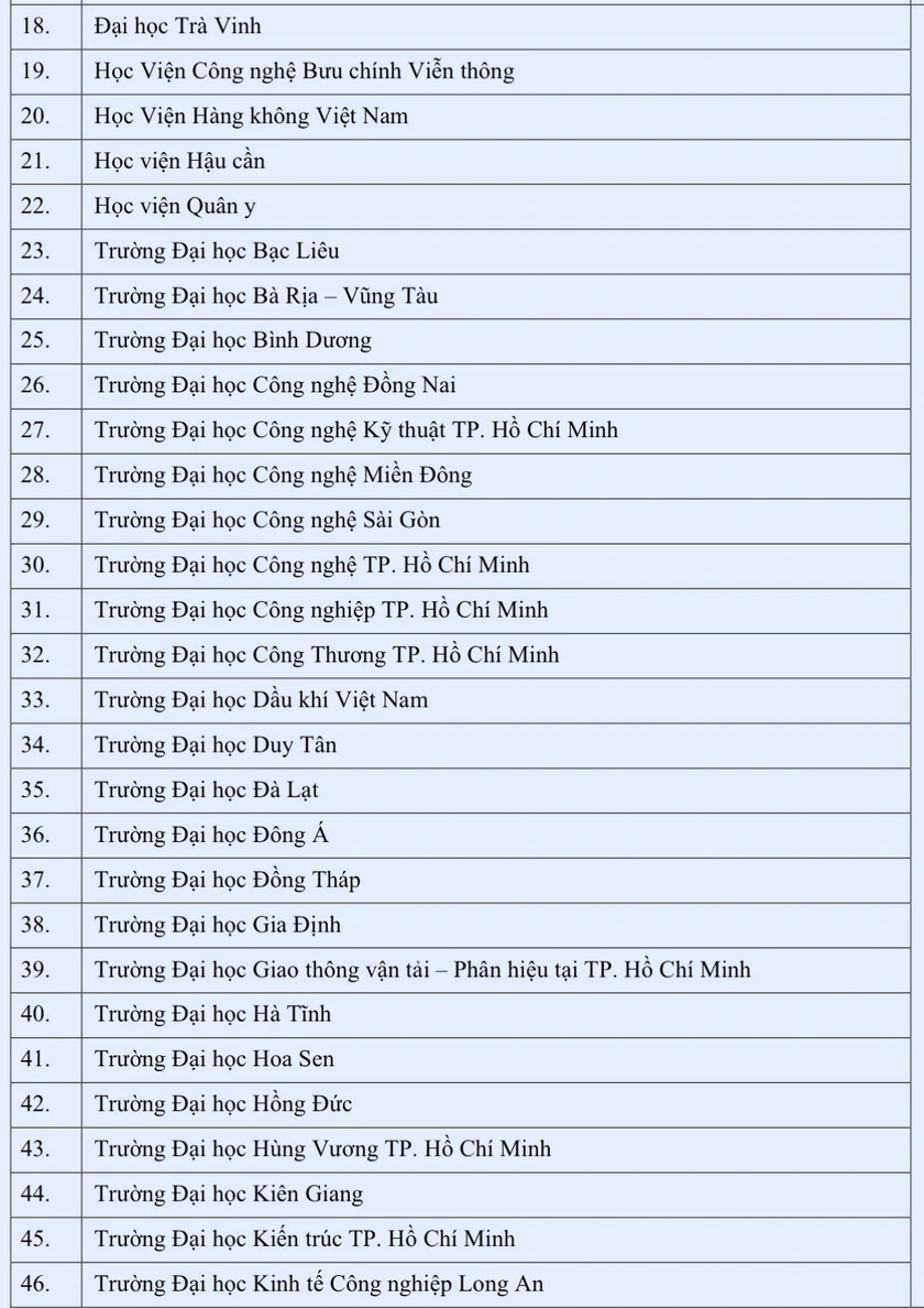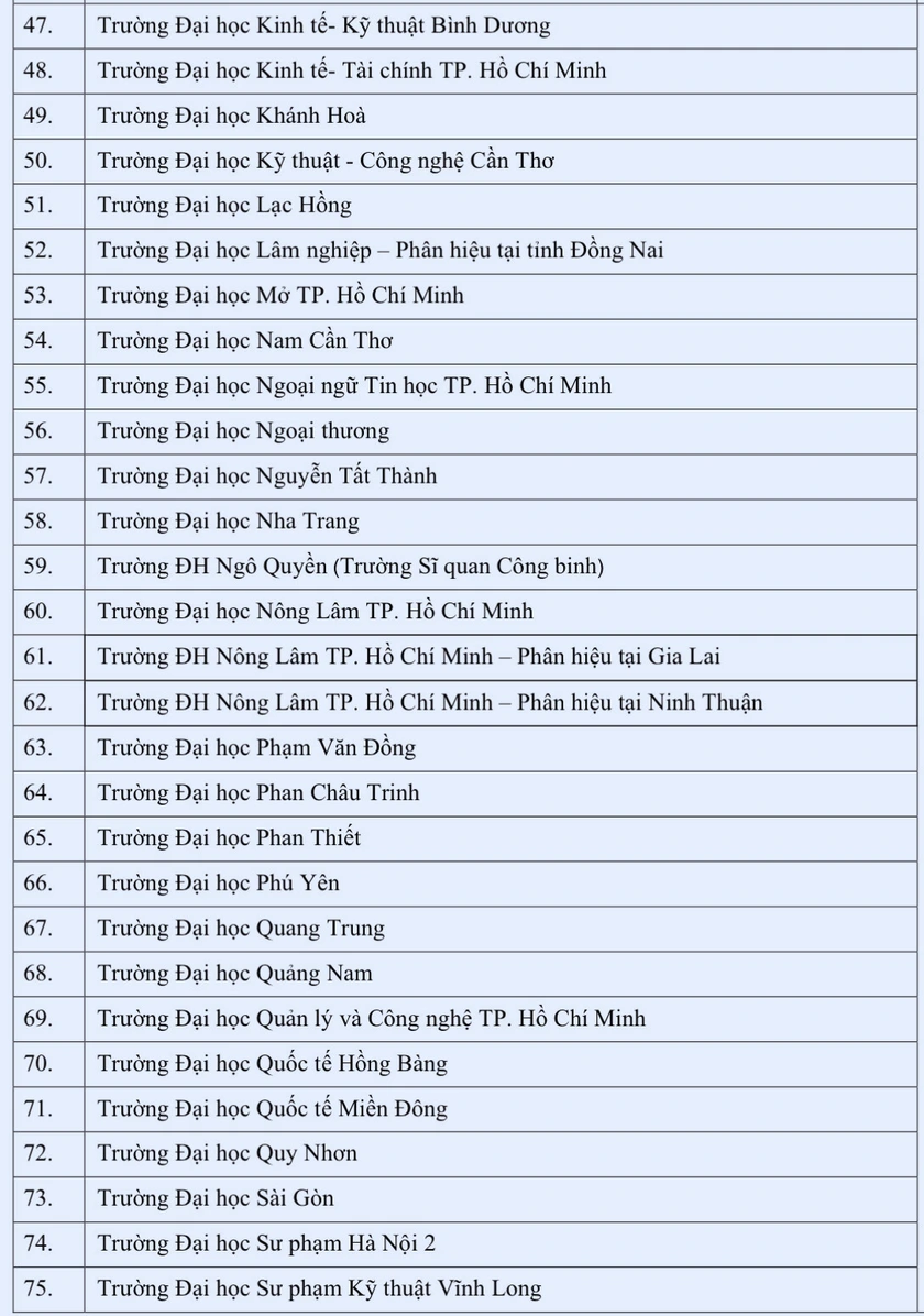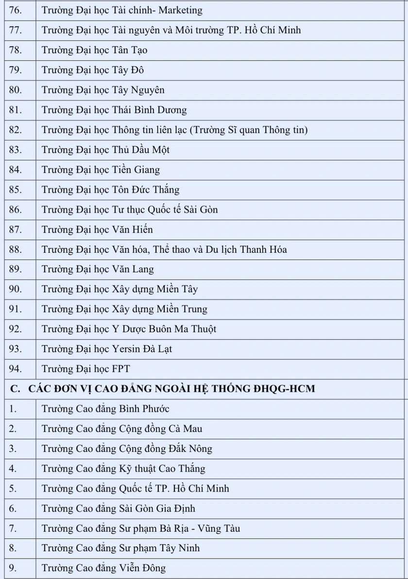 Trong đó, hệ thống Đại học Quốc gia Thành phố Hồ Chí Minh có 8 thành viên gồm: Trường Đại học Bách khoa, Trường Đại học Khoa học tự nhiên, Trường Đại học Khoa học xã hội và nhân văn, Trường Đại học Kinh tế - Luật, Trường Đại học Công nghệ thông tin, Trường Đại học Quốc tế, Trường Đại học An Giang, Trường Đại học Khoa học sức khỏe.