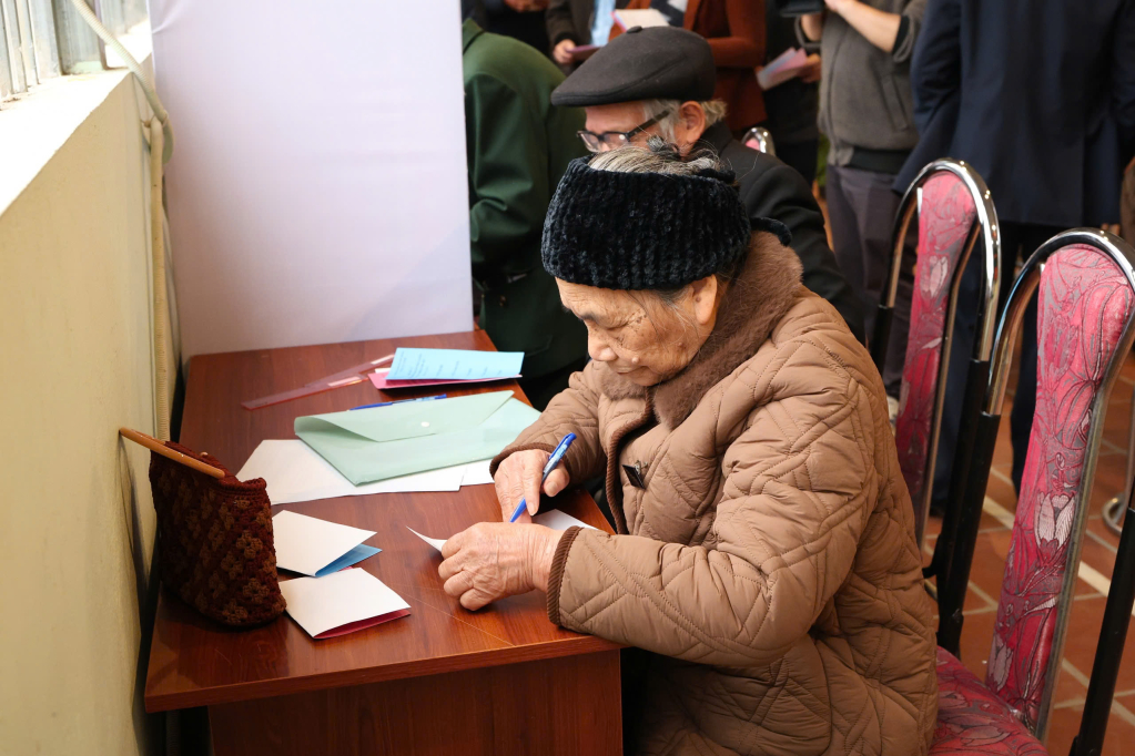 Cử tri cao tuổi, sức khỏe yếu được các địa phương mang hòm phiếu phụ đến tận nhà để bỏ phiếu.