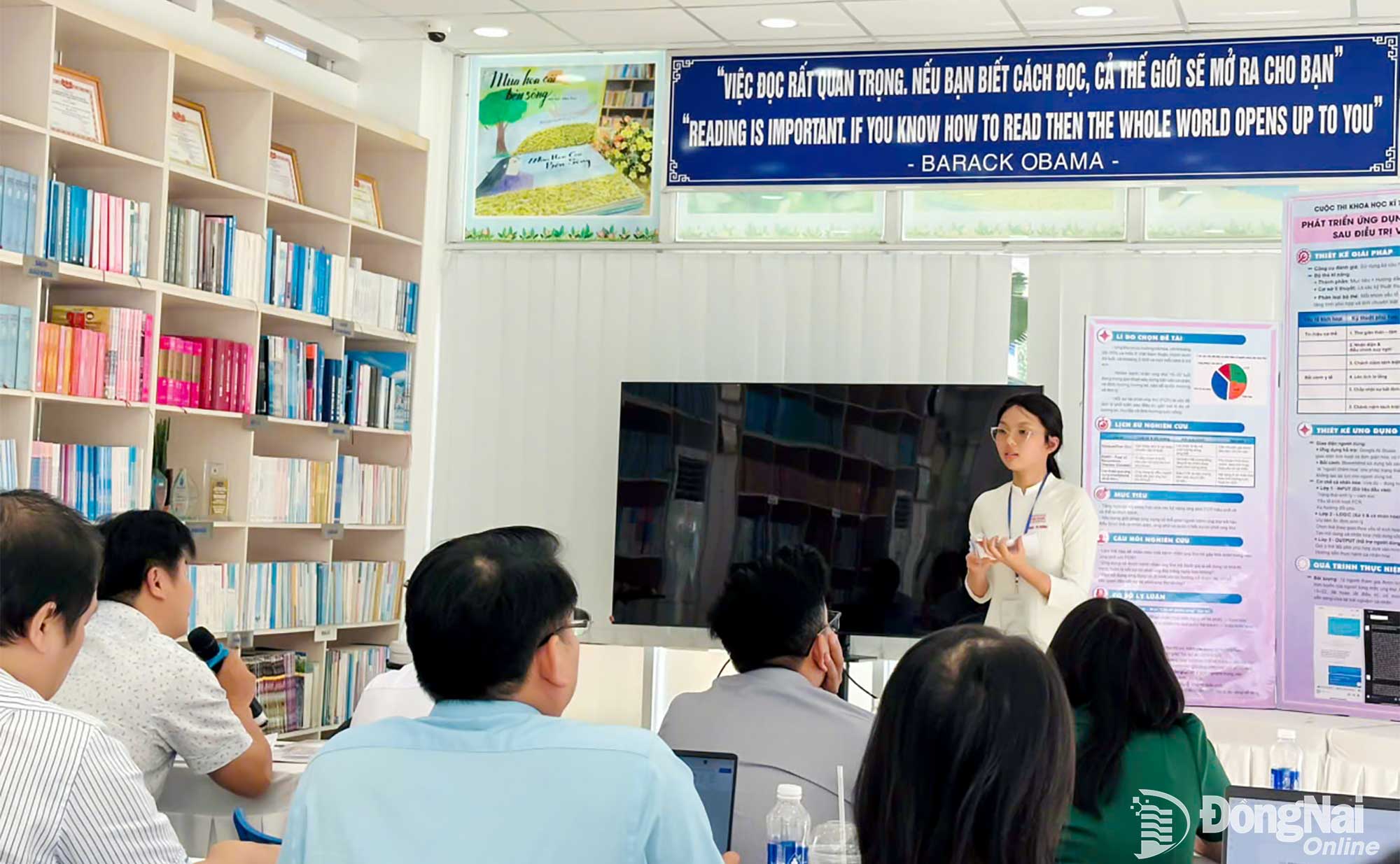 Em Đặng Thu Hương, học sinh Trường THPT chuyên Lương Thế Vinh, một trong các tác giả dự án đoạt giải nhất đang trình bày trước Ban giám khảo để giành suất thi cấp quốc gia. Ảnh: CTV