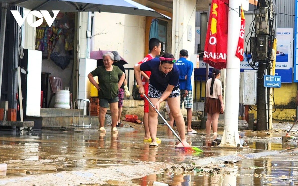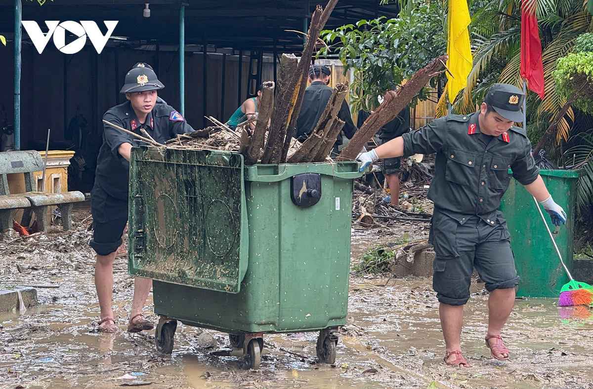 Lực lượng chức năng giúp người dân dọn vế sinh sau lũ