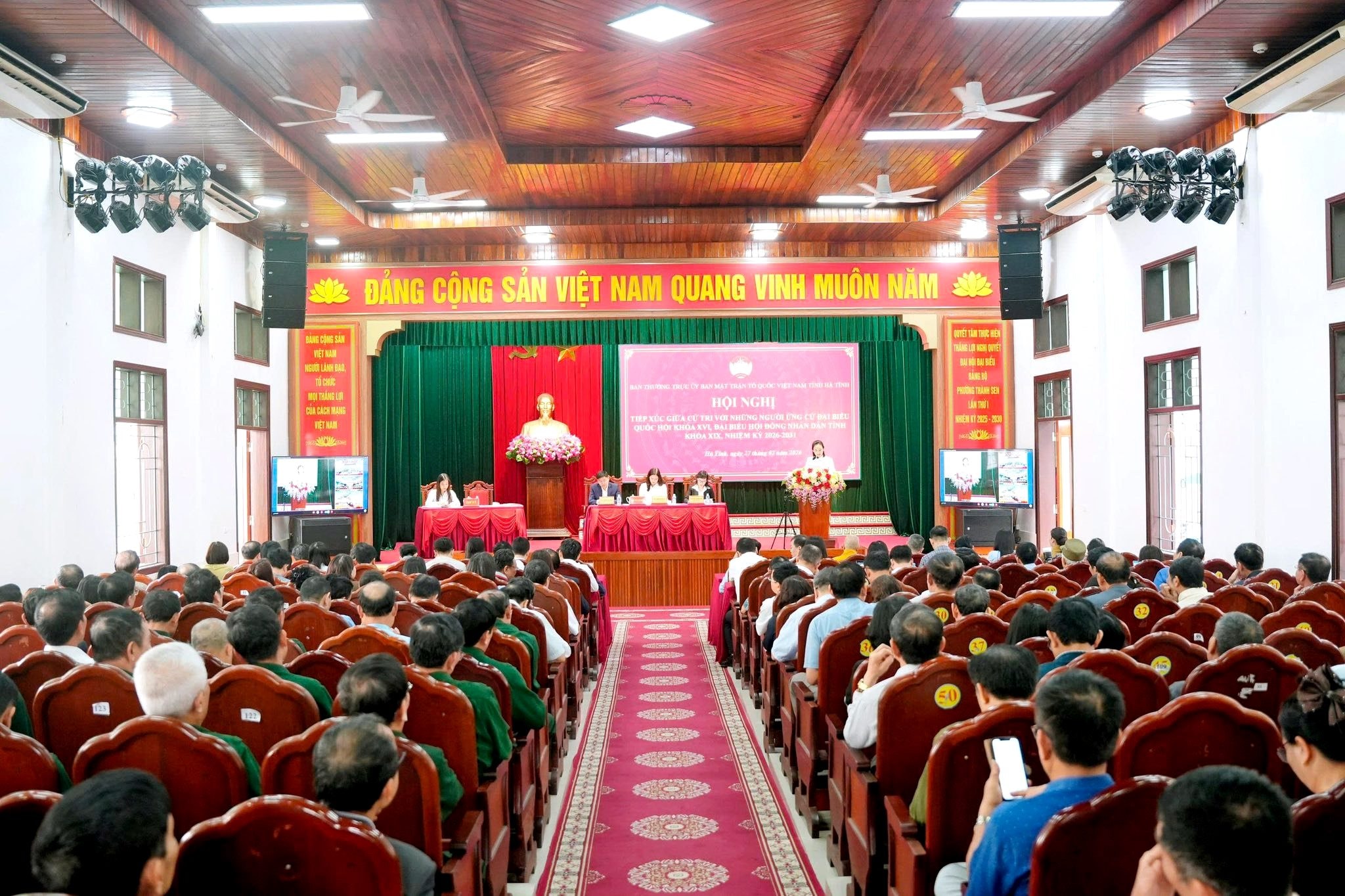 Ngày 27/2, tại phường Thành Sen, Ban Thường trực Ủy ban MTTQ tỉnh Hà Tĩnh tổ chức hội nghị tiếp xúc cử tri của những người ứng cử đại biểu Quốc hội Khóa XVI và đại biểu HĐND tỉnh khóa XIX tại đơn vị bầu cử số 2 (gồm các phường, xã: Thành Sen, Hà Huy Tập, Trần Phú, Thạch Hà, Toàn Lưu, Việt Xuyên, Đông Kinh, Lộc Hà, Mai Phụ, Can Lộc, Xuân Lộc, Gia Hanh, Đồng Lộc, Tùng Lộc, Hồng Lộc, Cổ Đạm, Nghi Xuân, Tiên Điền, Đan Hải) và đơn vị bầu cử số 5 (gồm các phường Thành Sen, Hà Huy Tập, Trần Phú).