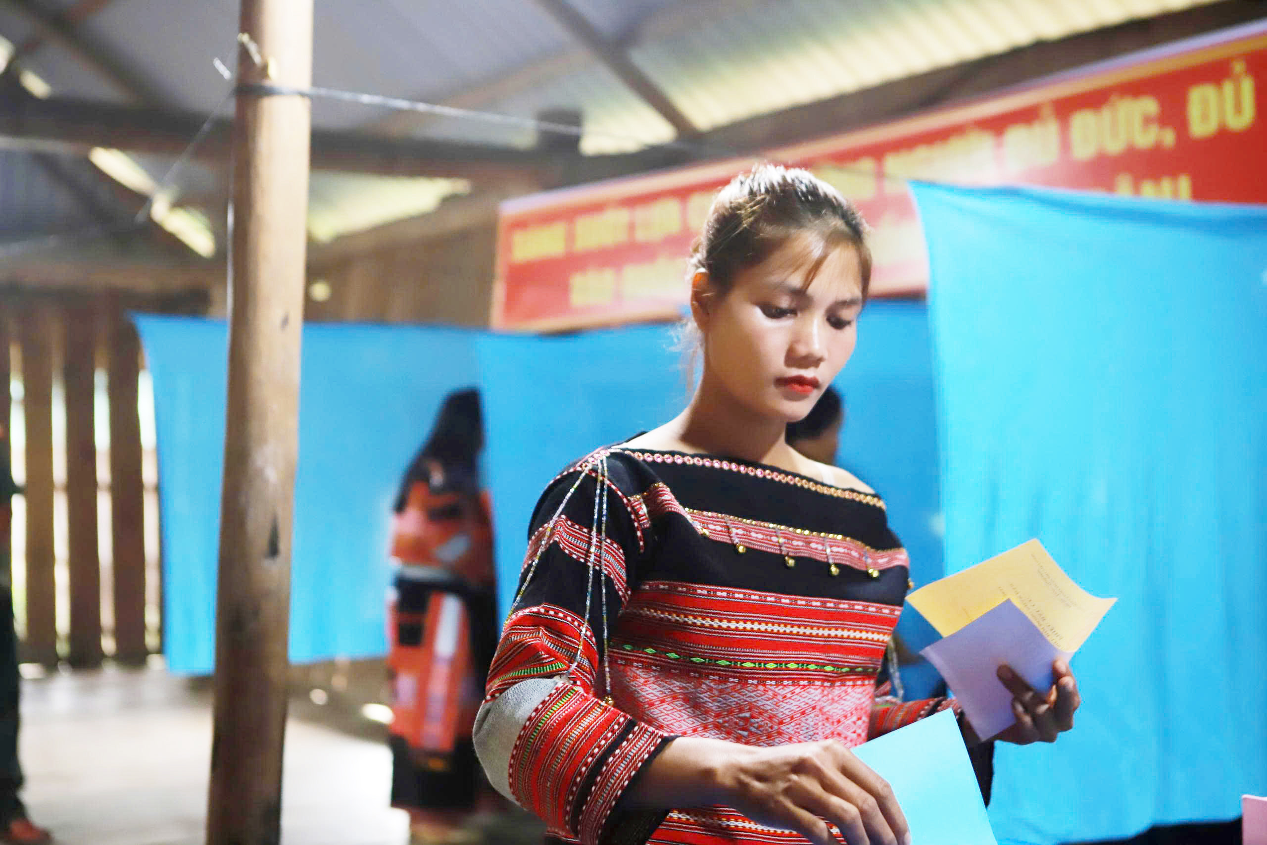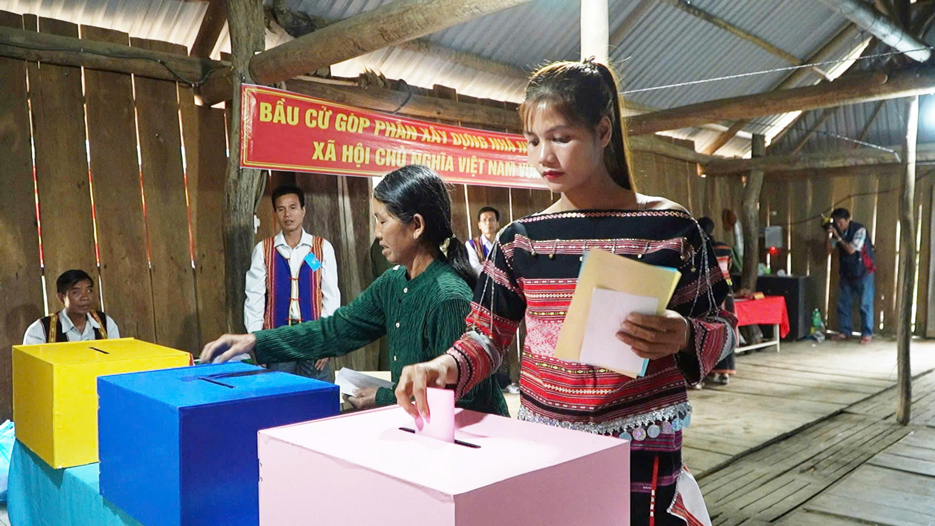 Cử tri làng O2 mặc đồng phục đại diện bản sắc văn hóa của dân tộc mình