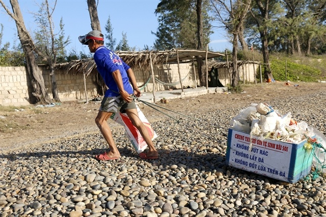 Ông Lê Thanh Tục còn gọi là Chín Tục, nhặt rác trên bãi đá 7 màu tại Bình Thuận cũ, nay là tỉnh Lâm Đồng, hồi tháng 2. Ảnh: Hồng Hiếu/TTXVN.