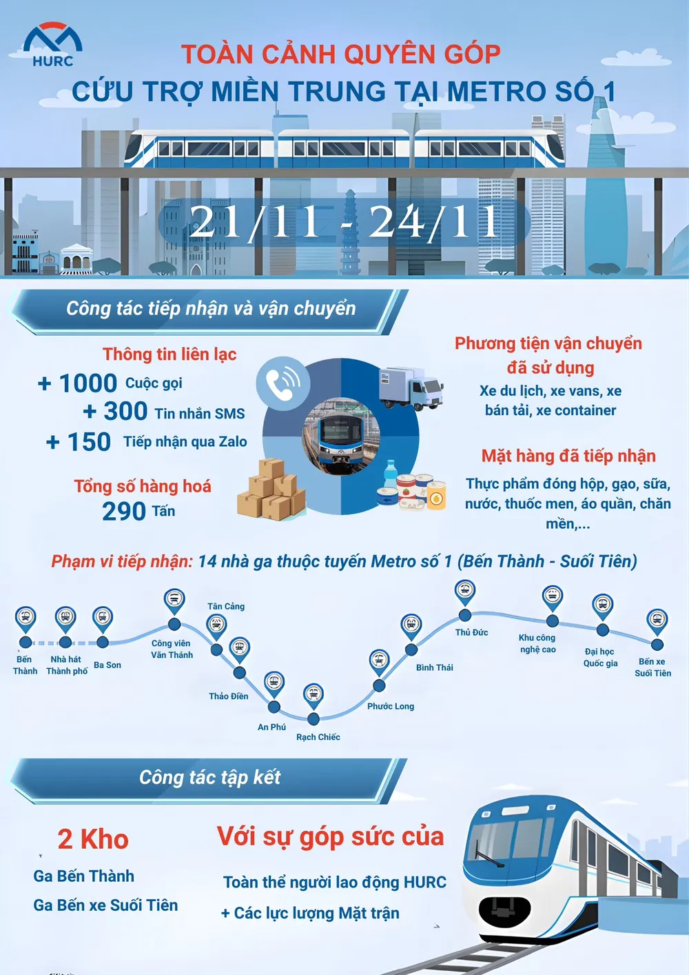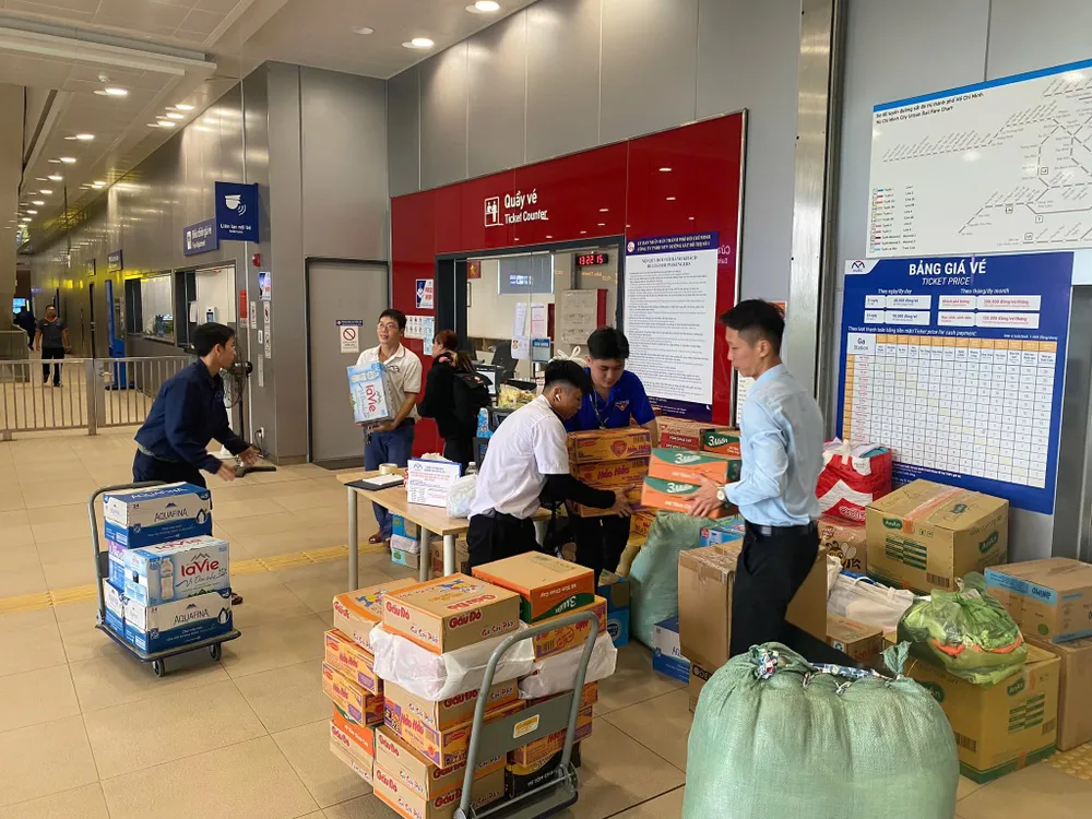 Mới đây, Công ty TNHH MTV Đường sắt đô thị số 1 (HURC1) cho biết chỉ trong 4 ngày (21-11 đến 24-11), hơn 290 tấn hàng cứu trợ miền Trung đã được tiếp nhận tại 14 nhà ga tuyến metro số 1, Bến Thành - Suối Tiên.