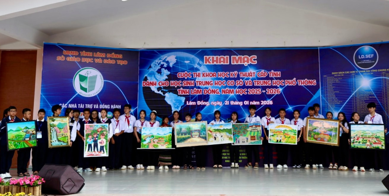 Ngay sau lễ khai mạc, Ban Tổ chức đã trao cờ lưu niệm cho các đơn vị dự thi; các đoàn học sinh lần lượt mang tranh, poster lên sân khấu giới thiệu ý tưởng nghiên cứu, chính thức khởi động vòng Chung kết Cuộc thi KHKT cấp tỉnh năm học 2025 - 2026.