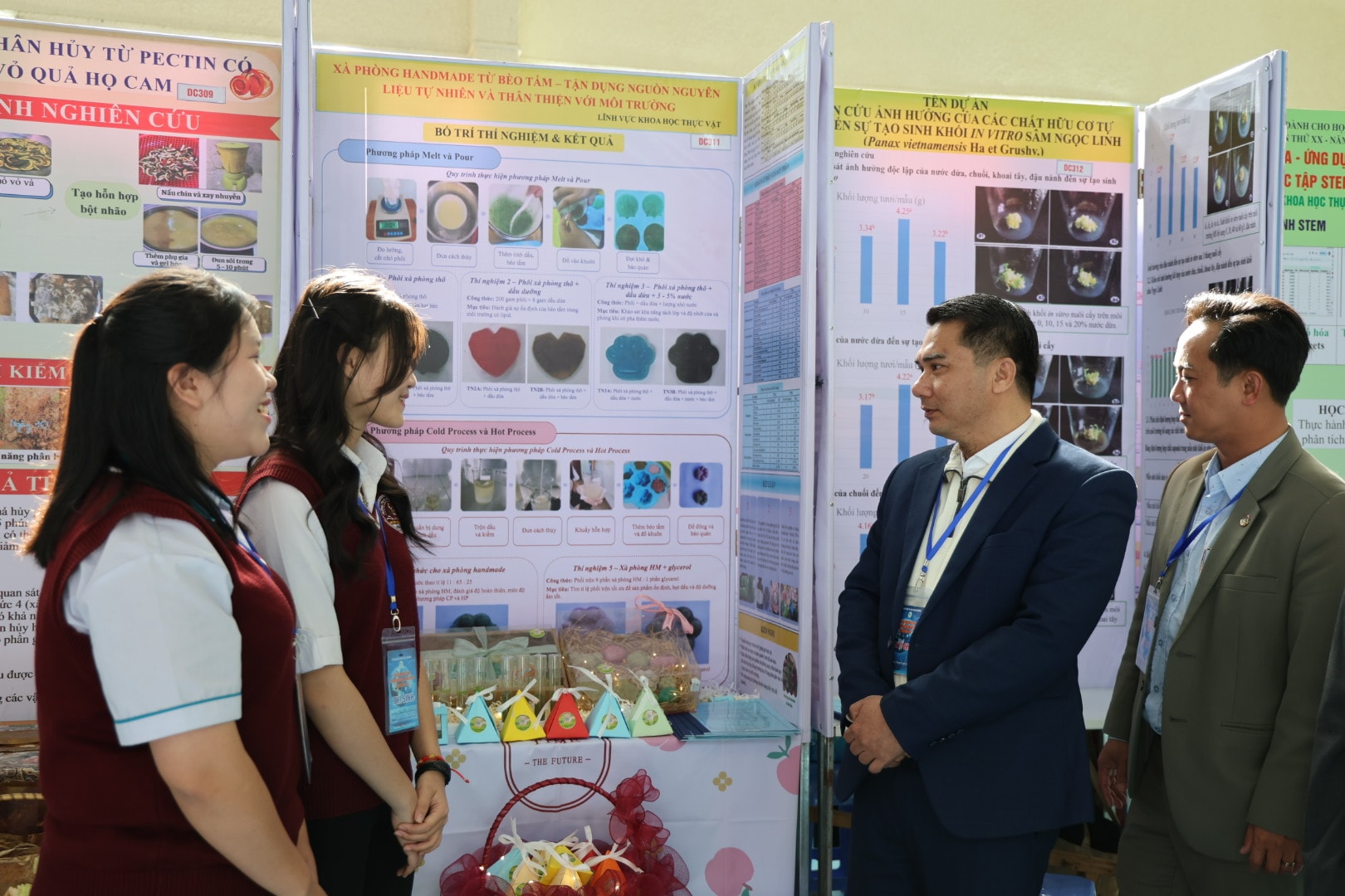 Học sinh thuyết minh, trao đổi về dự án nghiên cứu với đại biểu và Ban Giám khảo tại khu vực trưng bày