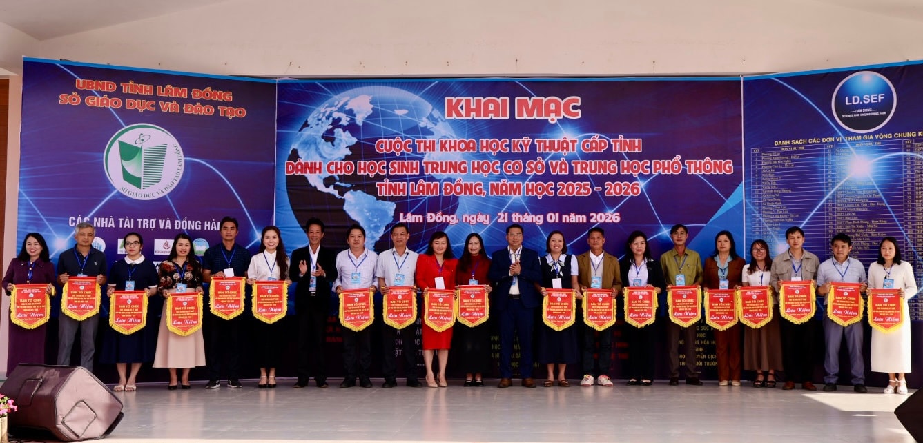 Ban Tổ chức trao cờ lưu niệm cho các đội thi tham gia Cuộc thi Khoa học kỹ thuật cấp tỉnh Lâm Đồng năm học 2025 - 2026