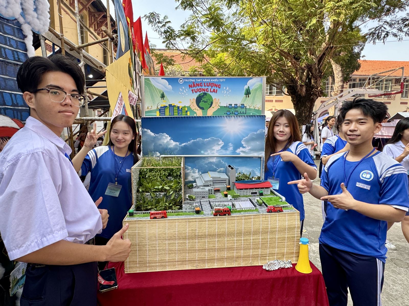 Học sinh trường THPT năng khiếu TDTT với mô hình năng lượng tương lai.
