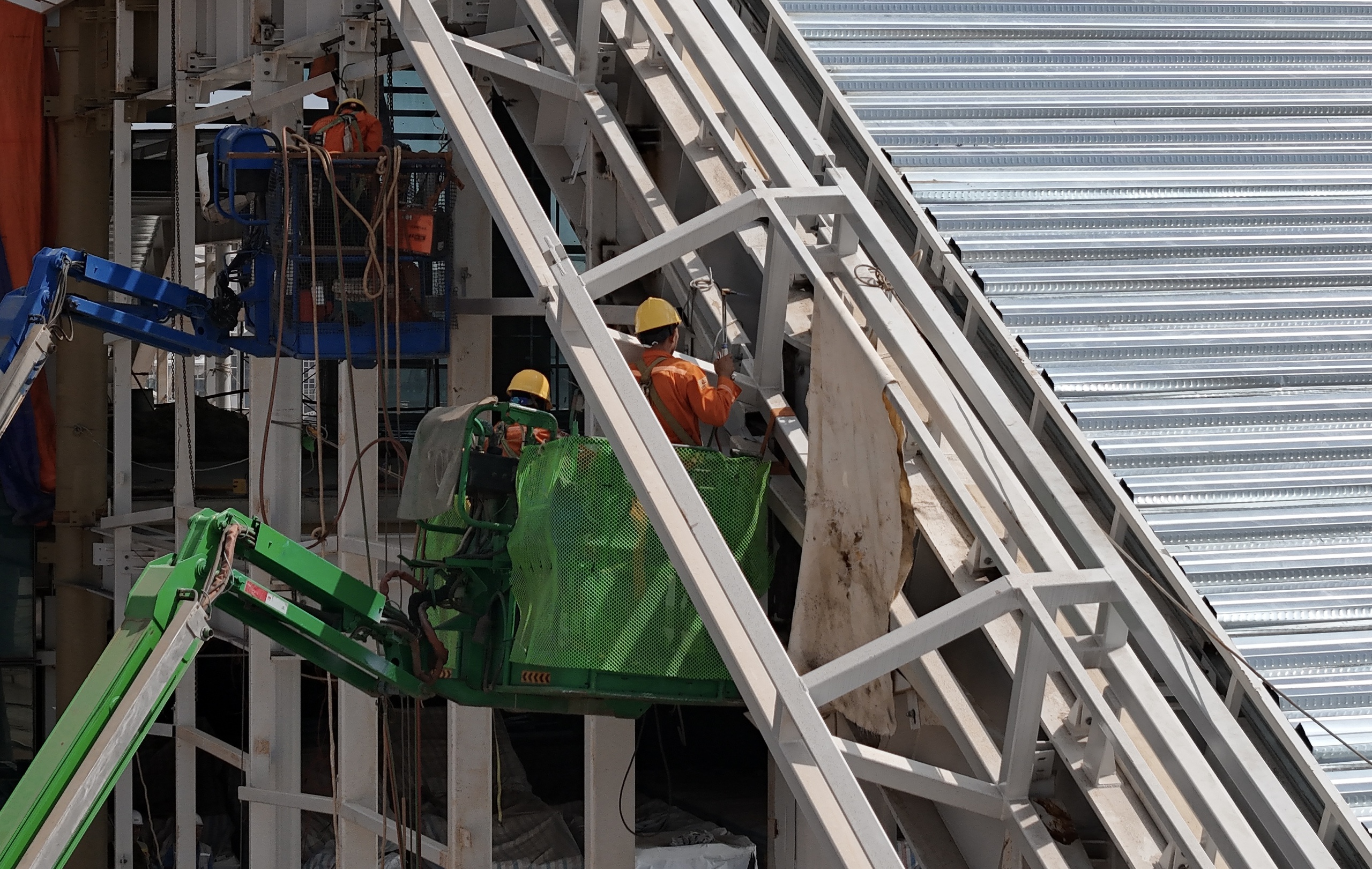 Trời nắng, các công nhân vẫn bám trụ trên mái nhà ga.