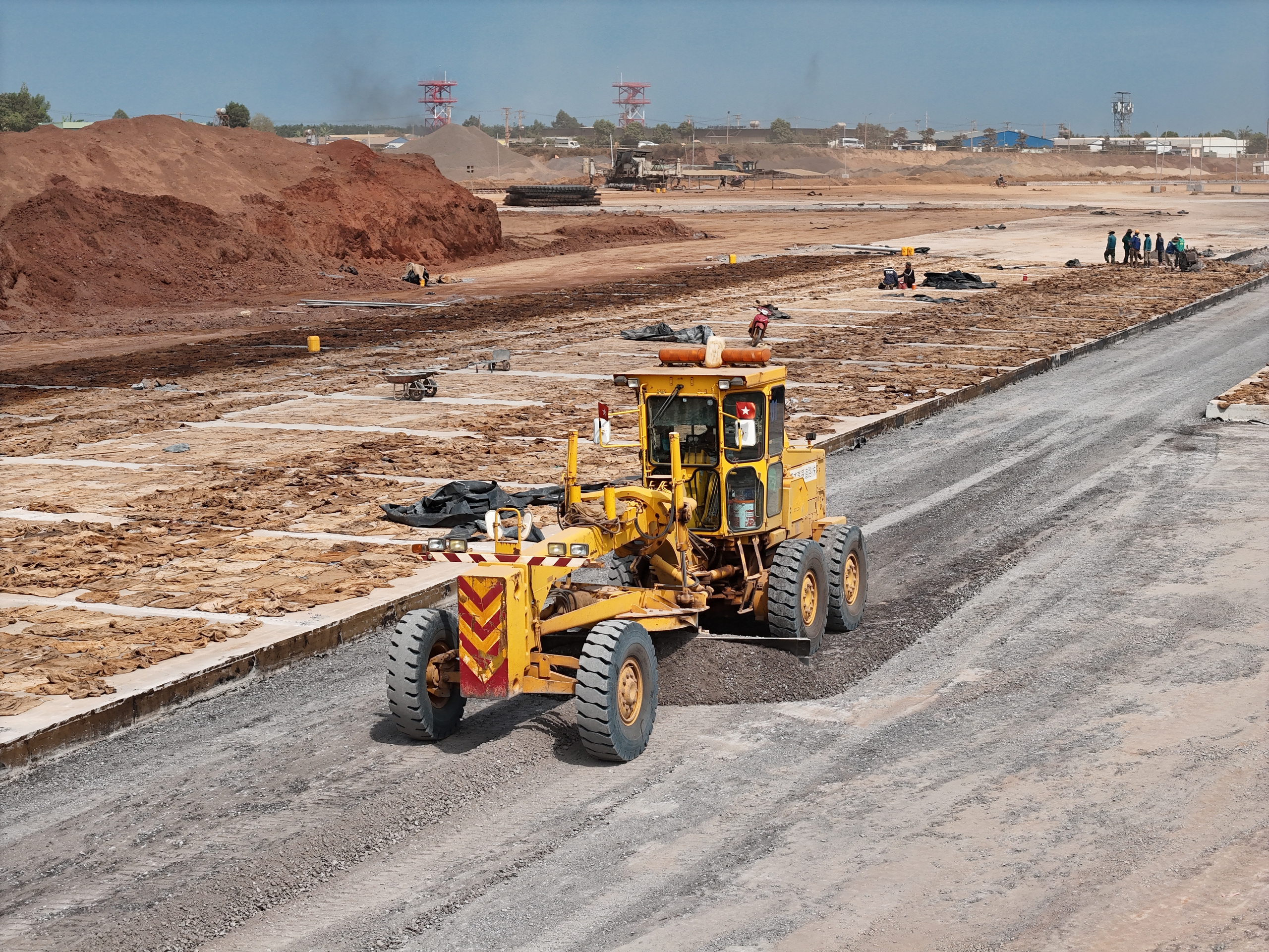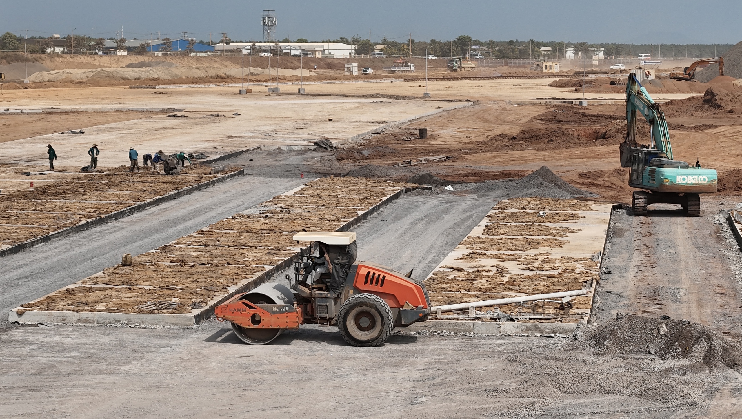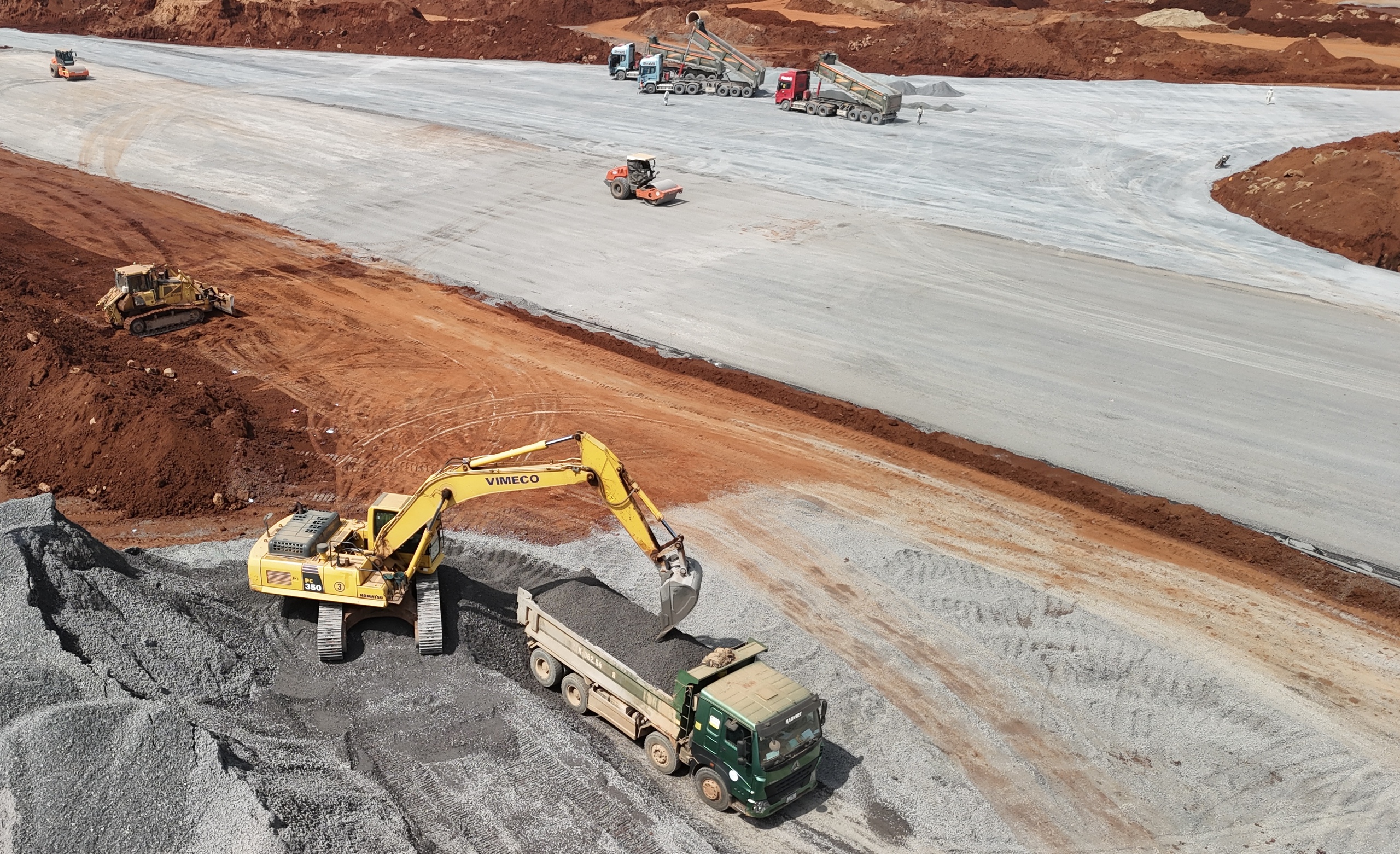Cách đó không xa, khu vực đường cất hạ cánh thứ hai và sân đỗ tàu bay cũng đang tăng tốc. Xe lu, xe rải bê tông, xe chở vật liệu nối đuôi nhau hoạt động liên tục. Trên công trường, các kỹ sư túc trực để kiểm soát cao độ, chất lượng từng lớp nền, bảo đảm các yêu cầu kỹ thuật nghiêm ngặt cho hạng mục đặc biệt quan trọng này.