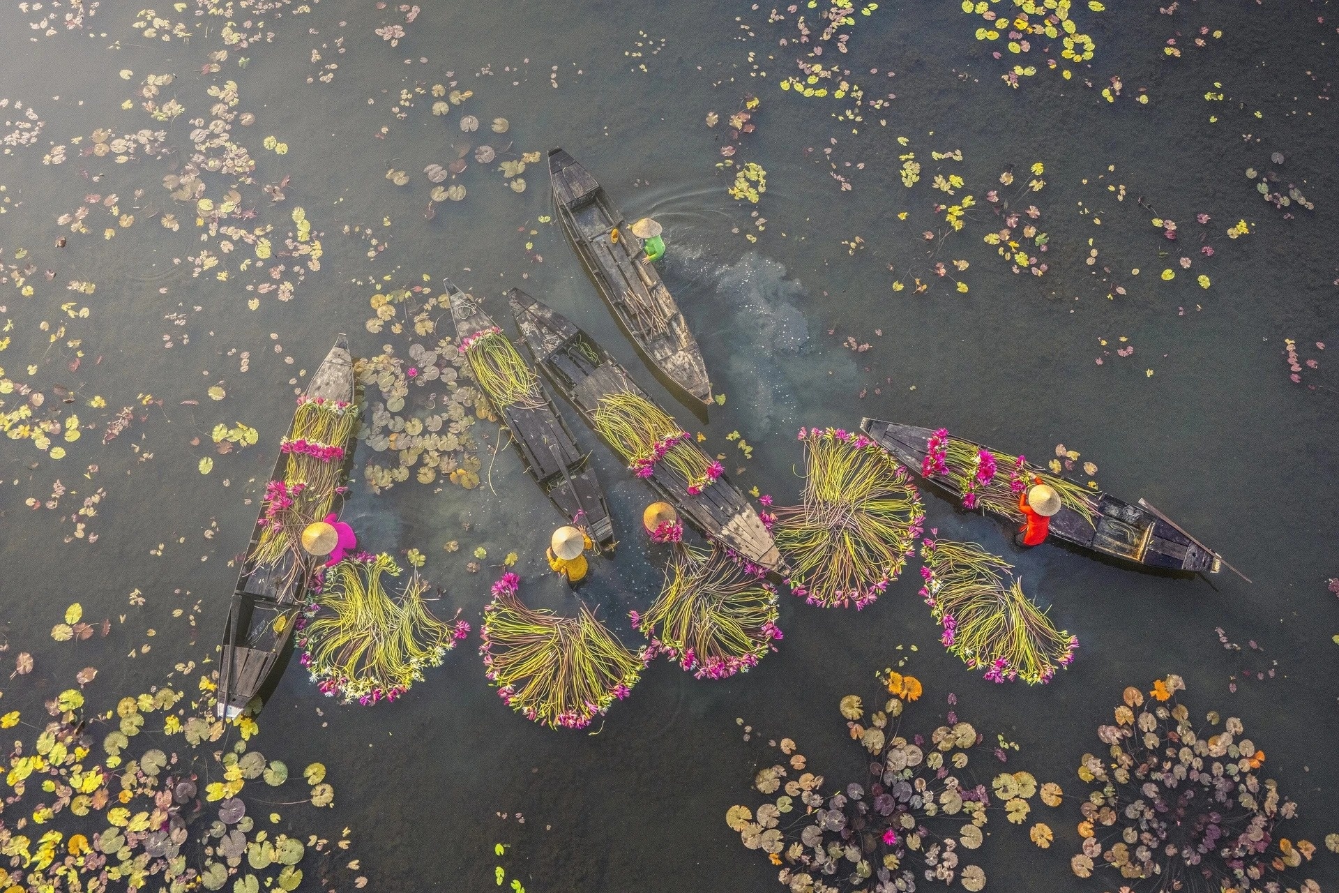 Mùa nước nổi tràn đồng cũng là lúc Tây Ninh bước vào vụ hoa súng. Từ sáng đến tối, những người phụ nữ rẽ nước, đưa xuồng đến thu hoạch hoa súng, tạo nên bức tranh ấn tượng. Ảnh: Nguyễn Khánh Vũ Khoa.