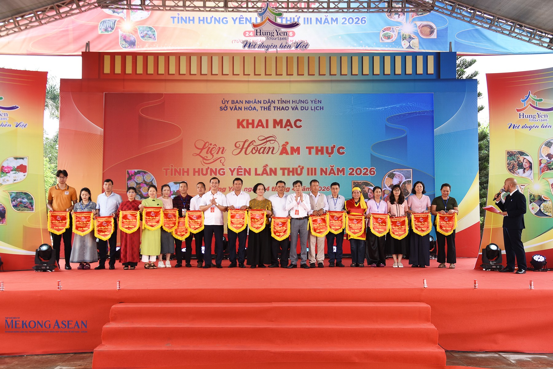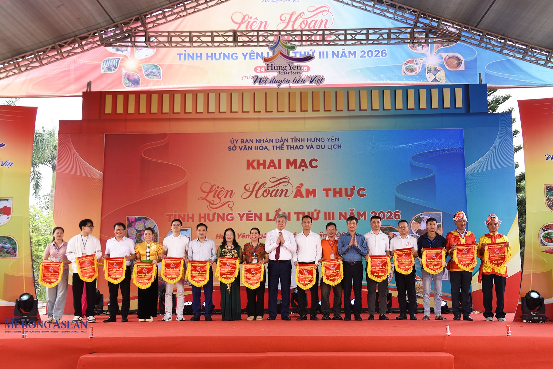 Lãnh đạo Sở Văn hóa, Thể thao và Du lịch tỉnh Hưng Yên tặng cờ lưu niệm cho các địa phương, hộ kinh doanh, đại diện thương hiệu ẩm thực tiêu biểu tham gia liên hoan. Ảnh: Mekong ASEAN.