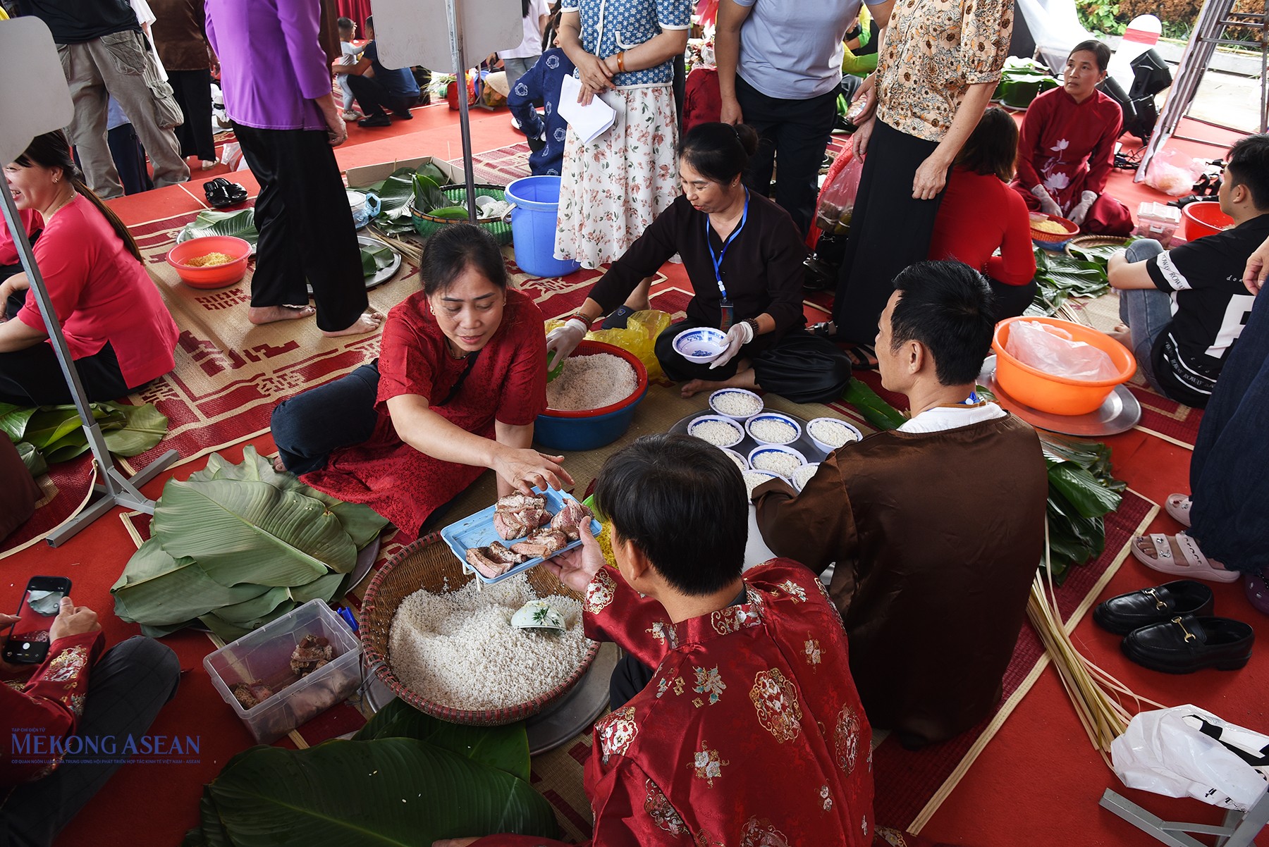 Phần thi gói nấu bánh chưng có sự tham gia của 9 đội đến từ các xã, phường trên địa bàn tỉnh Hưng Yên. Ảnh: Mekong ASEAN.