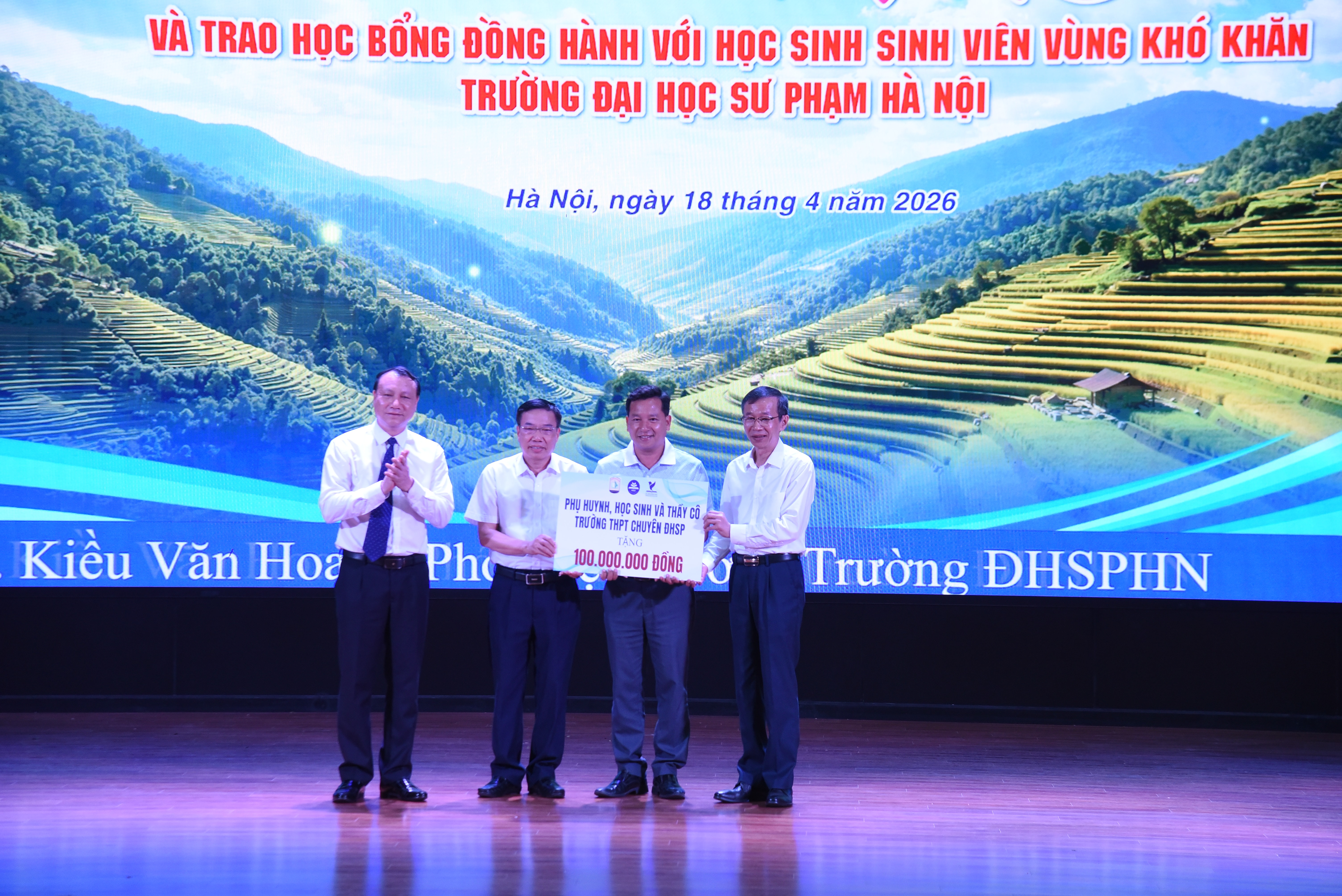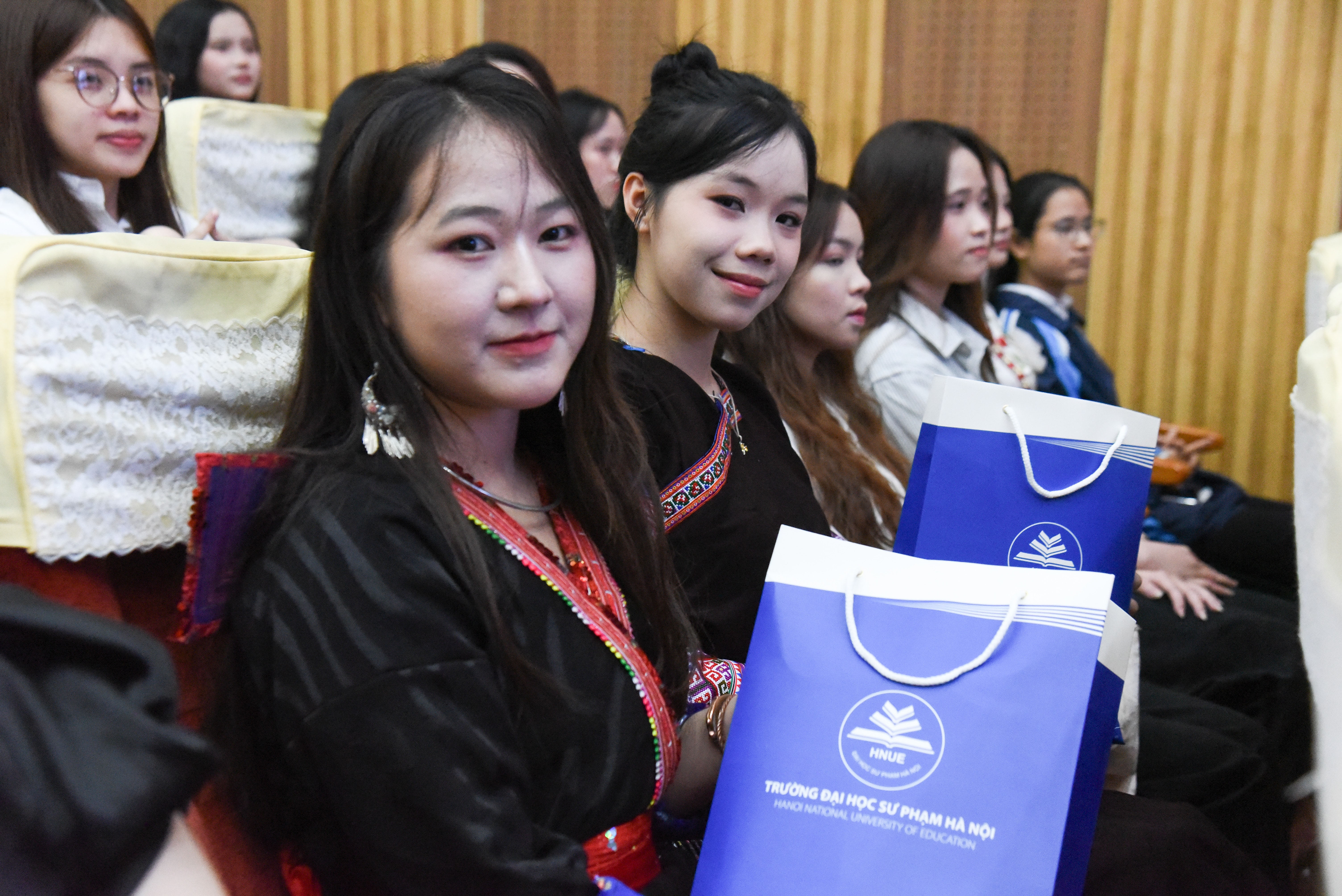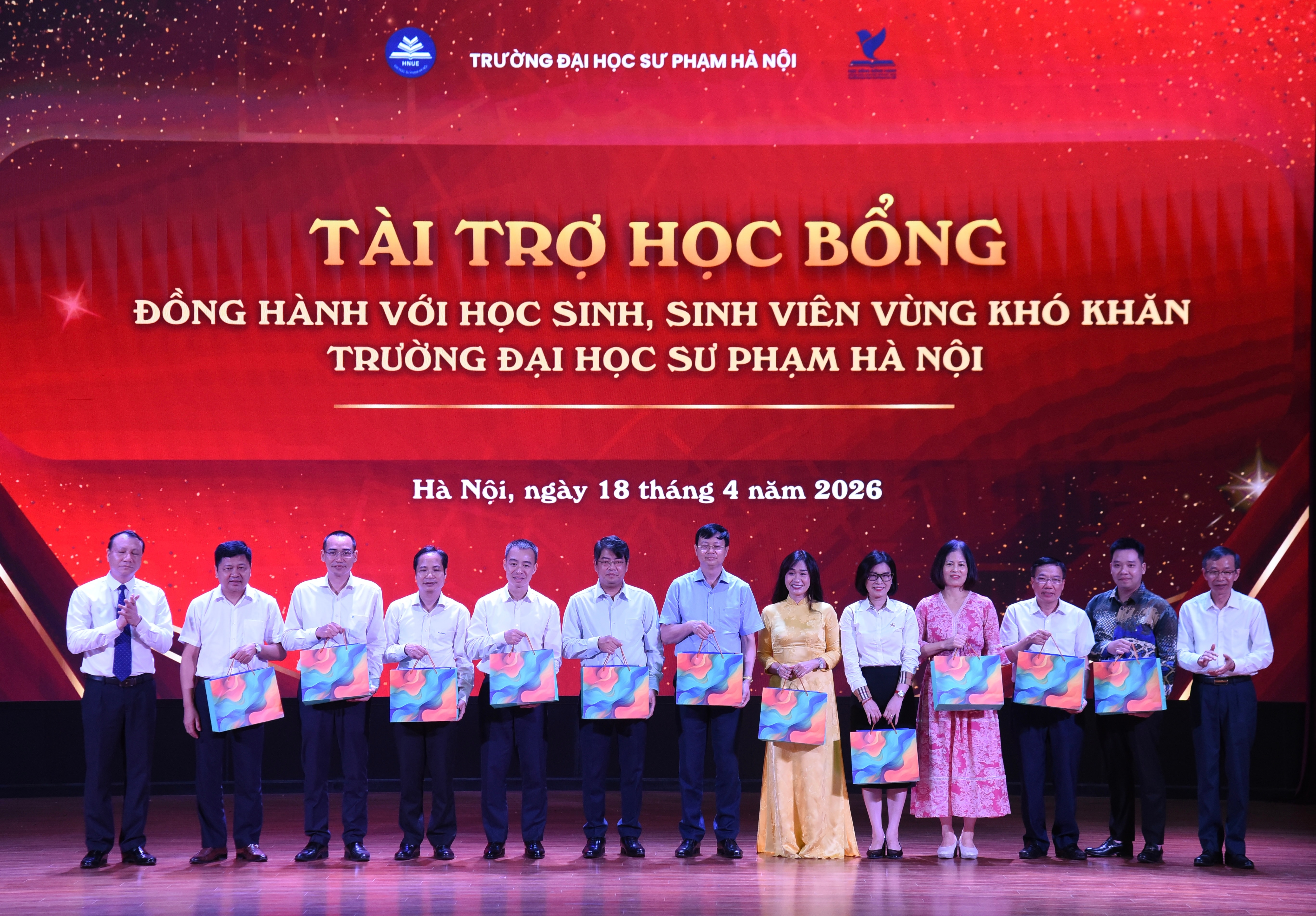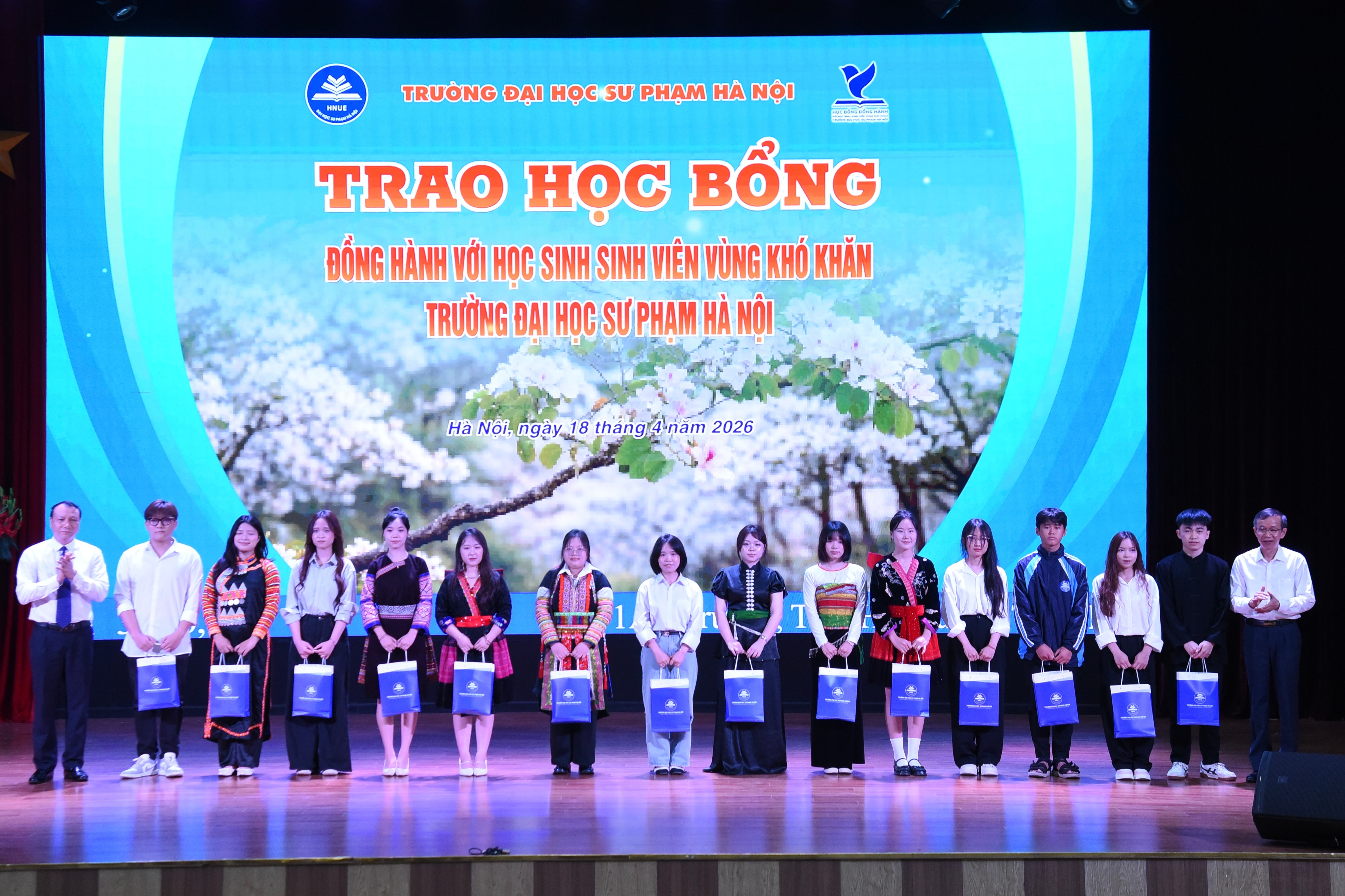 Tại chương trình, 16 sinh viên vùng khó khăn được nhận hỗ trợ 1,5 triệu đồng/thángtừ Quỹ đồng hành với học sinh, sinh viên vùng khó khăn của Trường Đại học Sư phạm Hà Nội.
