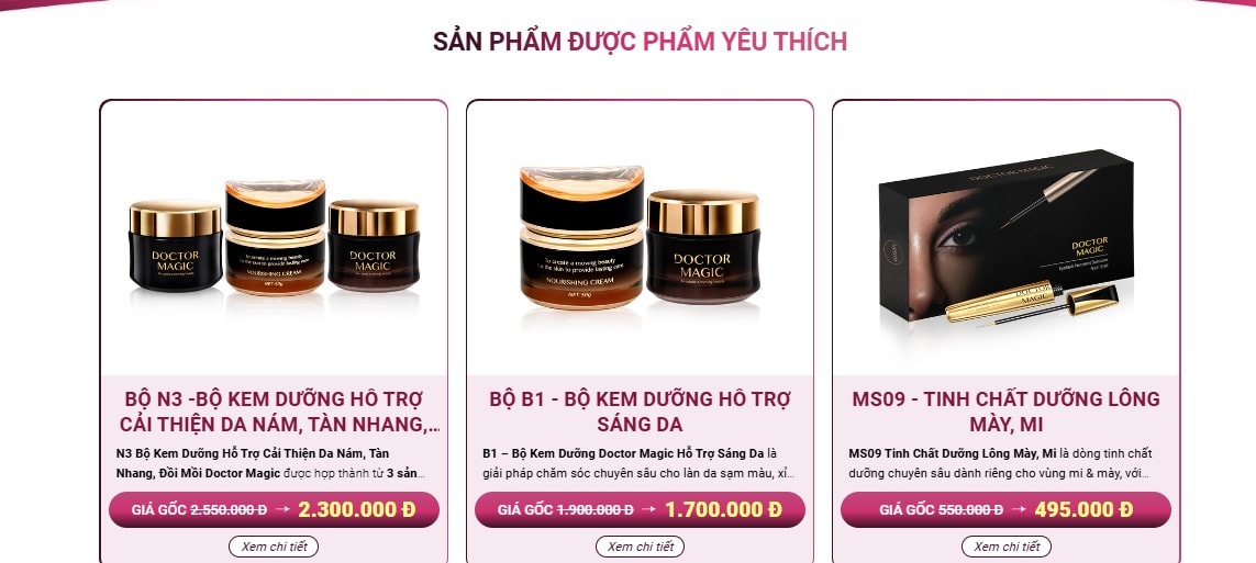 Danh mục sản phẩm được bày bán trên website Thẩm Mỹ Viện Mailisa. Ảnh chụp màn hình