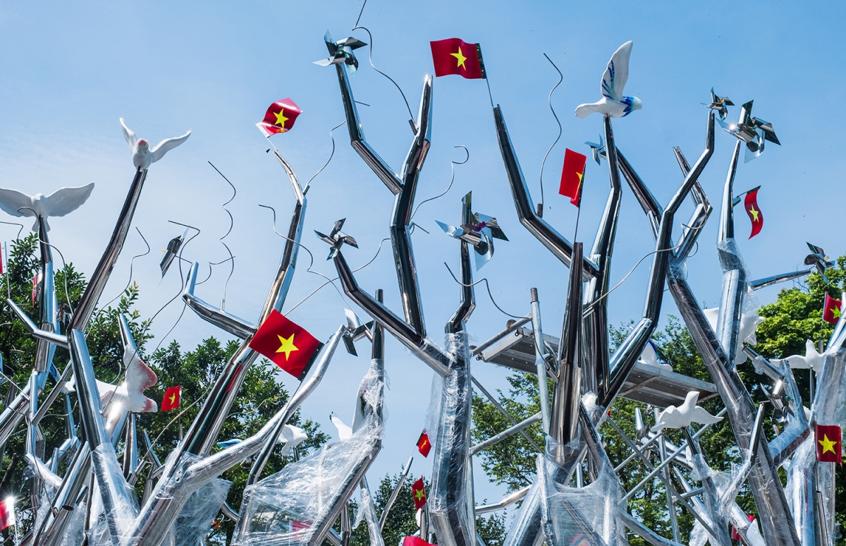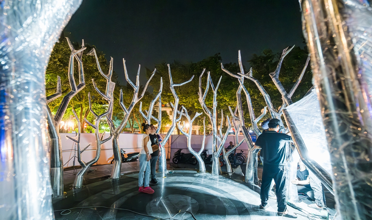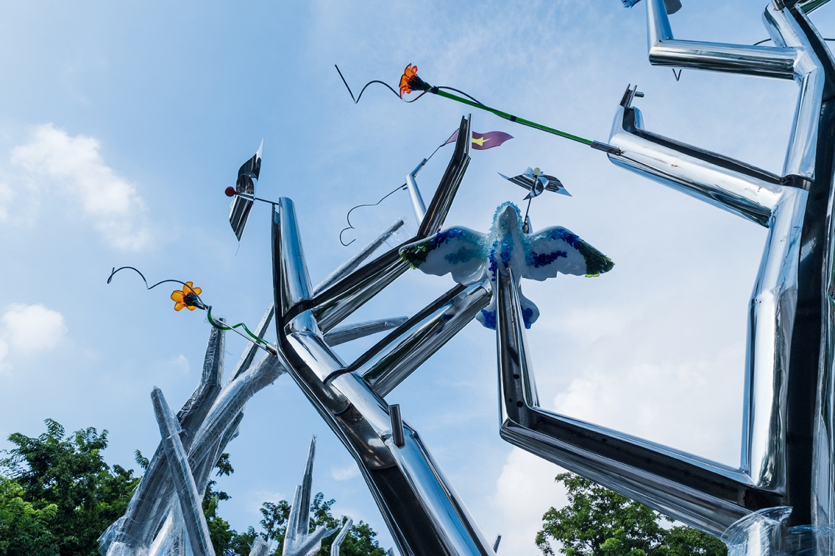 Nữ nghệ sĩ nhấn mạnh, “Kết đoàn” là một sắp đặt tại không gian mở, nơi thiên nhiên, ký ức và con người giao thoa trong ánh sáng và sự chuyển động. “Mỗi thân cây bằng thép không gỉ là một dòng chảy của năng lượng; mỗi bông hoa, cánh chim là một chi tiết mang tinh thần thủ công, văn hóa và cảm xúc,” cô chia sẻ.