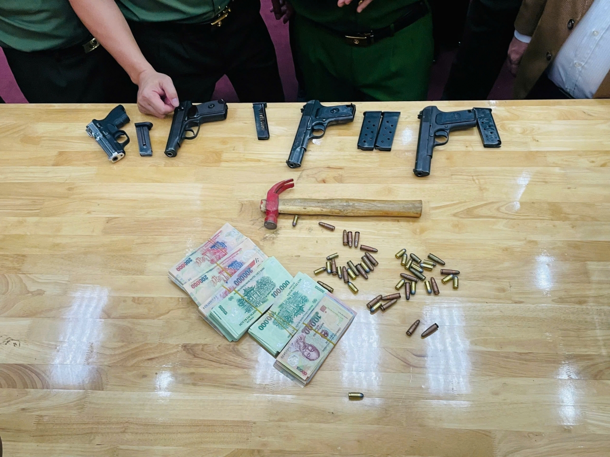 Tại nơi ở của Tài, lực lượng công an thu giữ 4 khẩu súng ngắn, 45 viên đạn, 2 dùi cui điện, 107 triệu đồng tiền mặt, 2 nhẫn vàng và nhiều tang vật liên quan.