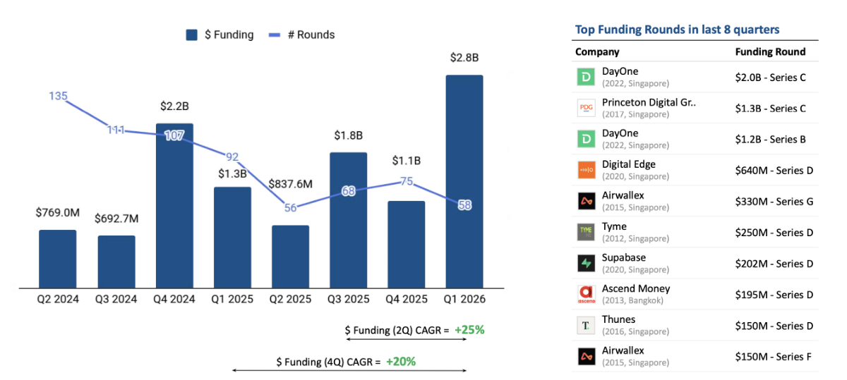 Ngoài ra, trong quý 1/2026, khu vực ghi nhận 5 vòng gọi vốn có giá trị trên 100 triệu USD, tăng so với 2 vòng ở quý 4/2025 và 3 vòng của quý 1/2025, cho thấy xu hướng các thương vụ quy mô lớn đang quay trở lại.