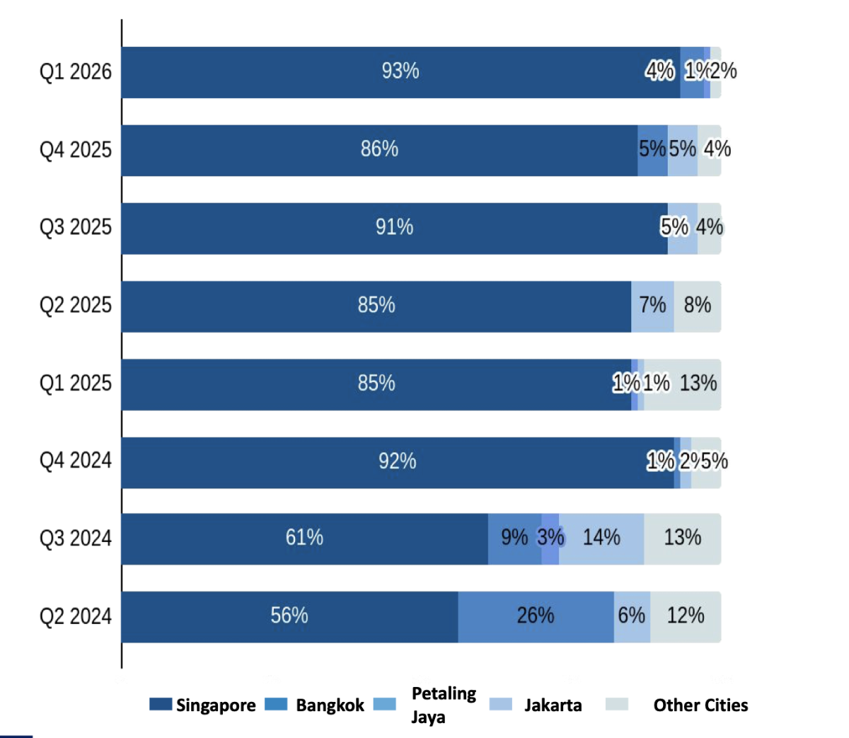 Xét theo khu vực, Singapore tiếp tục là trung tâm của hệ sinh thái công nghệ Đông Nam Á khi chiếm tới 93% tổng vốn đầu tư toàn khu vực. Bangkok đứng ở vị trí tiếp theo, nhưng chỉ chiếm khoảng 4%.