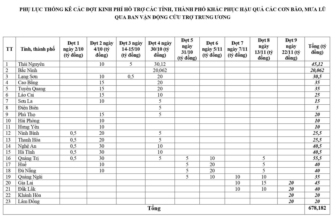 Với tinh thần phân bổ kịp thời để hỗ trợ nhân dân vượt qua khó khăn do mưa lũ gây ra, từ số tiền tiếp nhận được, Ban Vận động Cứu trợ Trung ương đã phân bổ 9 đợt với tổng số tiền là 678,182 tỷ đồng tới 23 địa phương chịu thiệt hại nặng nề bởi mưa lũ gây ra trong thời gian vừa qua.