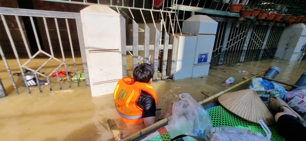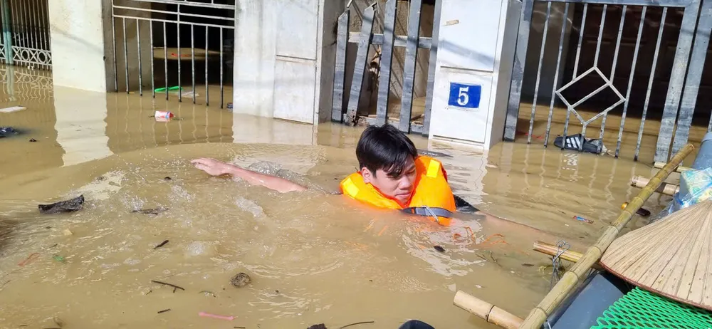 Các con hẻm nhỏ, ngập sâu khiến xuồng lớn không thể vào được, chiếc bè nhỏ của hai bạn trở nên hữu ích. Giữa dòng nước xiết, hai Sơn phân công nhiệm vụ rõ ràng: một người vừa bơi vừa kéo bè, người còn lại trao tay bà con từng món đồ cứu trợ.