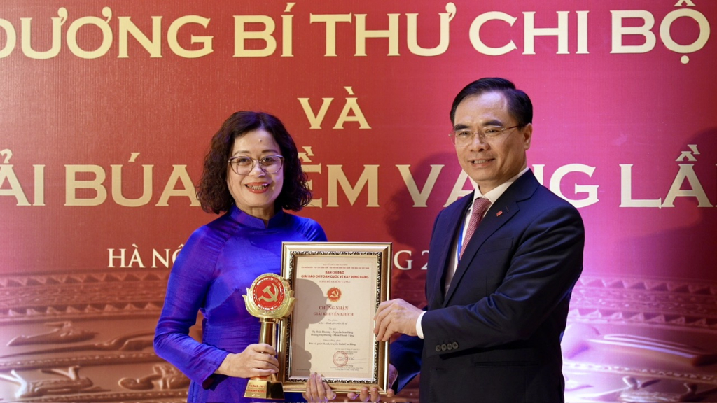Đồng chí Dương Trung Ý, Ủy viên Trung ương Đảng, Tổng Biên tập Tạp chí Cộng sản trao chứng nhận cho đại diện nhóm tác giả đoạt giải của Báo và Phát thanh, truyền hình Cao Bằng.