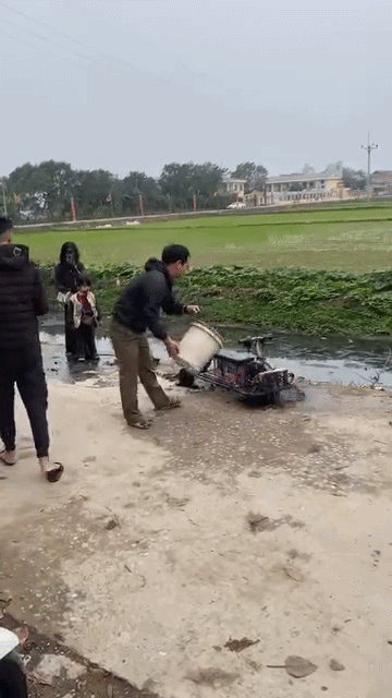 Theo đoạn clip ghi lại, 2 bé gái ăn mặc đẹp đẽ để đi chơi Tết; đồng thời chở nhau trên chiếc xe điện, dạo quanh con đường làng. Đáng nói, sau một lúc đi dạo, 2 "búp măng non" này không may mất lái, lao thẳng xe điện xuống mương nước đen sì.