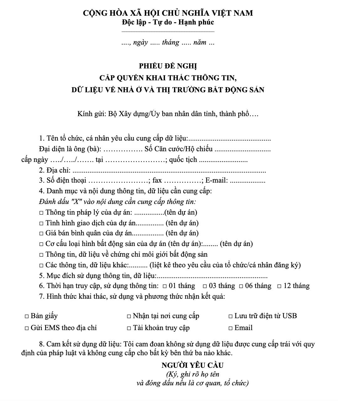 Đầu tiên, bạn hãy tải về mẫu đơn này, Phiếu đề nghị cấp quyền khai thác thông tin, dữ liệu về nhà ở và thị trường bất động sản.docx điền đầy đủ các thông tin cần thiết, sau đó in ra và đến bộ phận một cửa của Bộ Xây dựng để nộp hồ sơ.