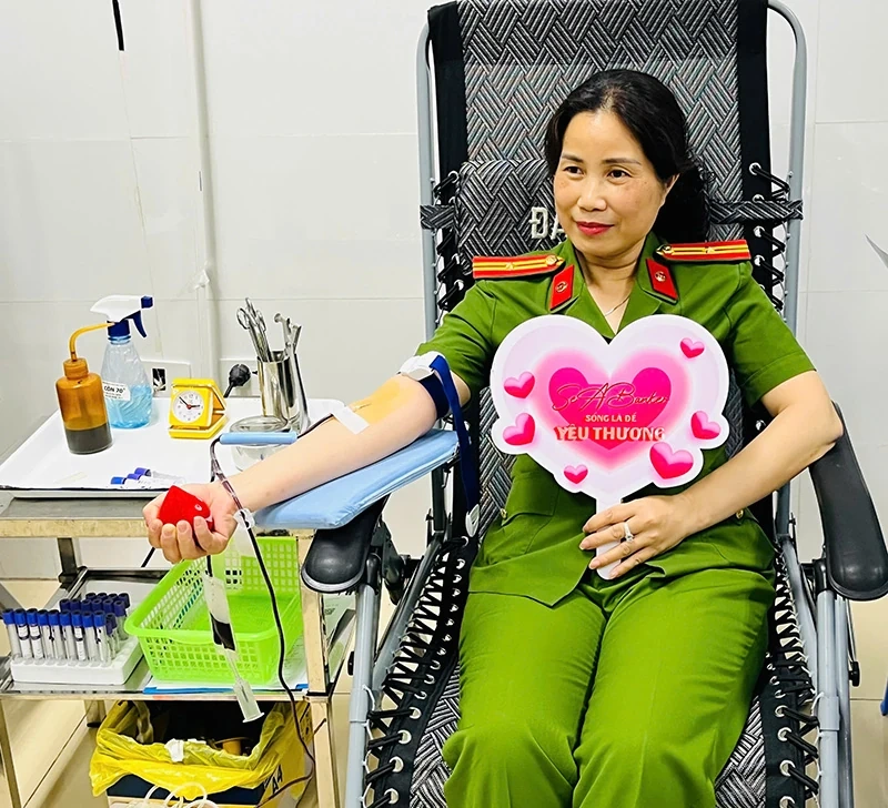 Thiếu tá Lưu Thúy Hà, cán bộ Đội Chính trị - Hậu cần, Phòng Cảnh sát cơ động Công an tỉnh trực tiếp hiến máu.