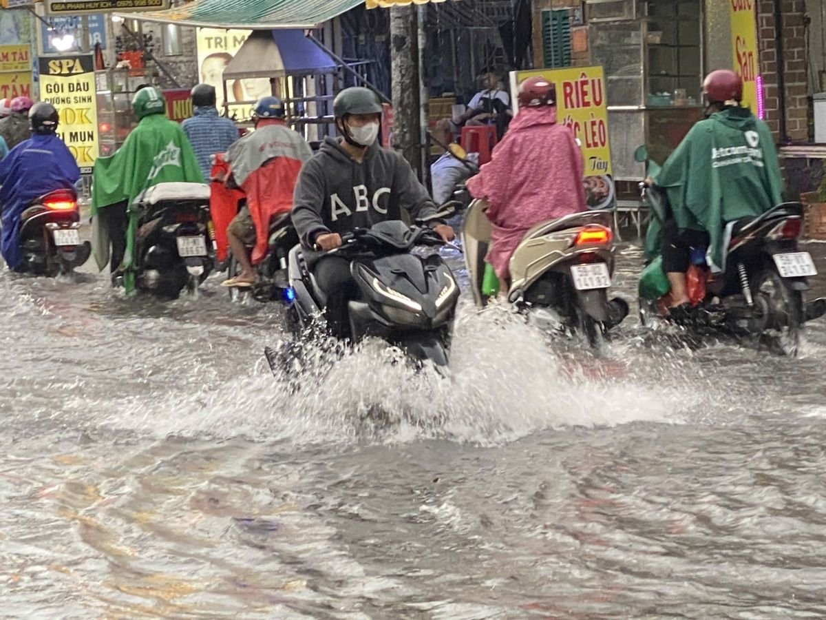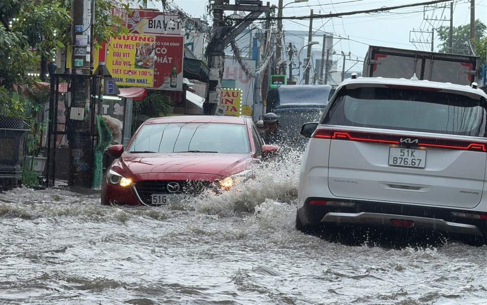 Mưa lớn kéo dài cộng triều cường khiến nhiều đoạn đường ngập sâu hơn bánh xe