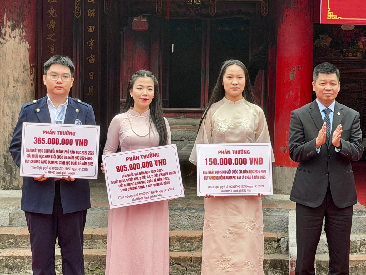 Theo quyết định chi khen thưởng của Hà Nội đối với học sinh, giáo viên có thành tích cao trong các cuộc thi trong nước và quốc tế, học sinh được thưởng 300 triệu đồng đối với Huy chương Vàng Olympic quốc tế; thưởng 200 triệu đồng đối với học sinh giành Huy chương Bạc Olympic quốc tế; thưởng 150 triệu đồng đối với học sinh giành Huy chương Đồng Olympic quốc tế; thưởng 100 triệu đồng đối với giải Khuyến khích…