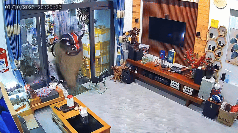 Sau khi con lân này vào nhà, còn cố tình nằm dài trong phòng khách càng khiến 2 mẹ con sợ hơn. Một lúc sau, một người của đoàn lân liền vào để dẫn con lân ra ngoài. Toàn bộ khoảnh khắc "dở khóc dở cười" của 2 mẹ con đã được camera an ninh ghi lại.