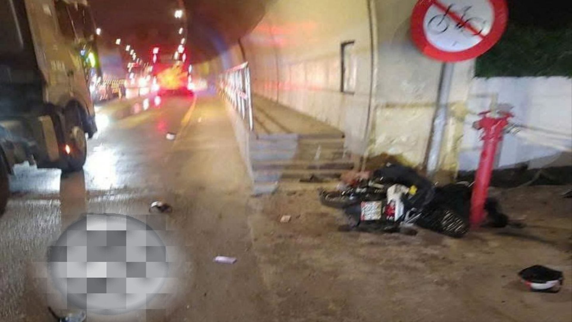 Khi đến vị trí trên, xe máy bất ngờ tông vào bên phải lan can dành cho người đi bộ ngay cửa hầm Phú Gia.