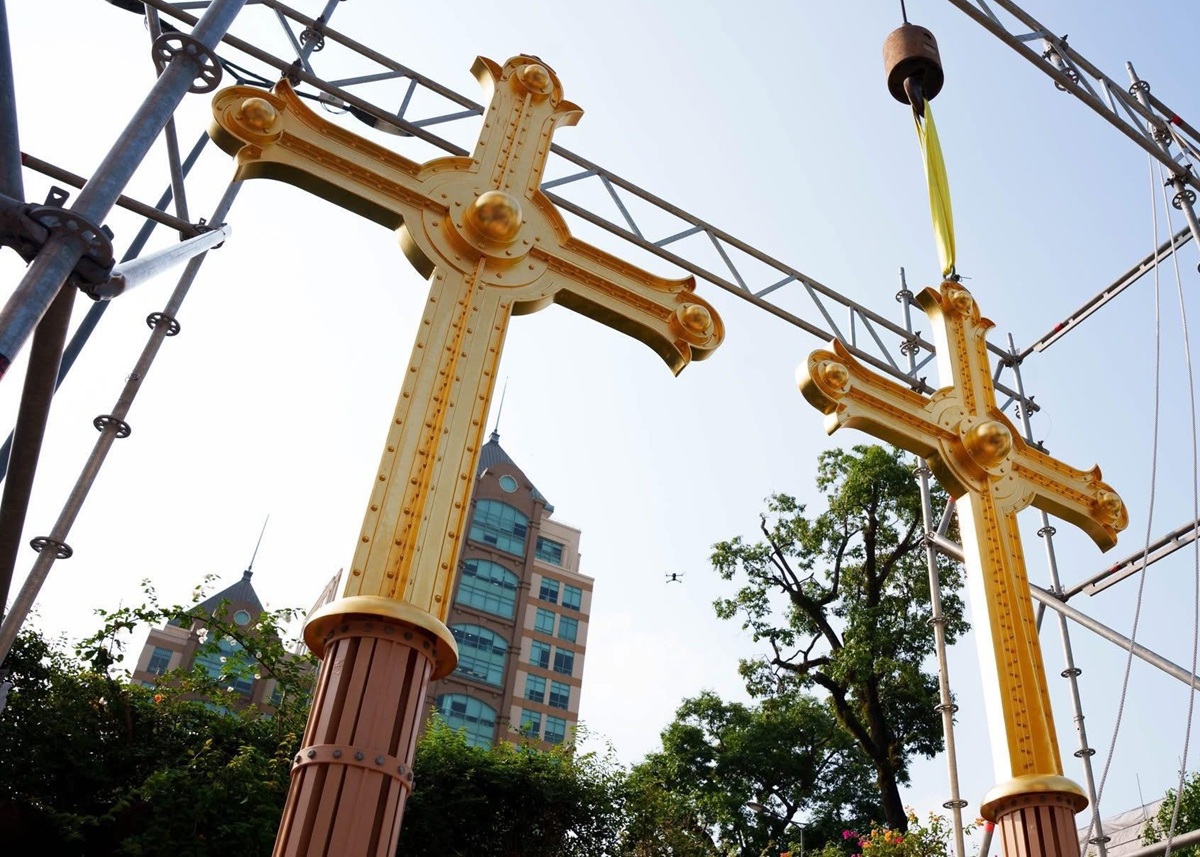 Hai Thánh giá mới được chế tác bằng thép, phủ vàng lá bên ngoài nhằm tăng độ bền trước điều kiện khí hậu nhiệt đới. Theo thiết kế, các lớp bảo vệ được xử lý kỹ lưỡng để đảm bảo tuổi thọ có thể lên đến khoảng 200 năm. Trước đó, vào tháng 3/2023, hai Thánh giá cũ đã được hạ xuống sau 128 năm hiện diện do xuống cấp nghiêm trọng và không thể phục chế.