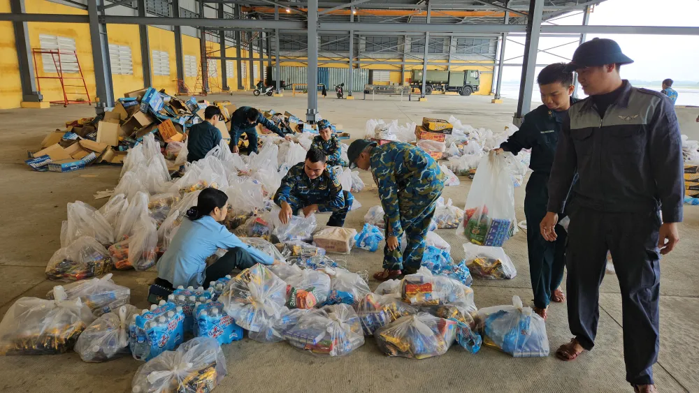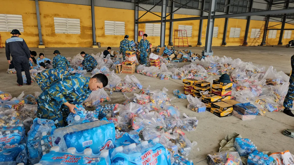 20 tấn hàng hóa tương tự đang được cơ động bằng ô tô vào Gia Lai, Đắk Lắk và Khánh Hòa. Mỗi suất hàng cứu trợ gồm mỳ tôm, sữa, nước uống, xúc xích, bánh ngọt...