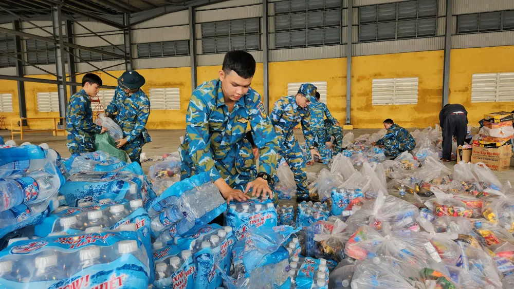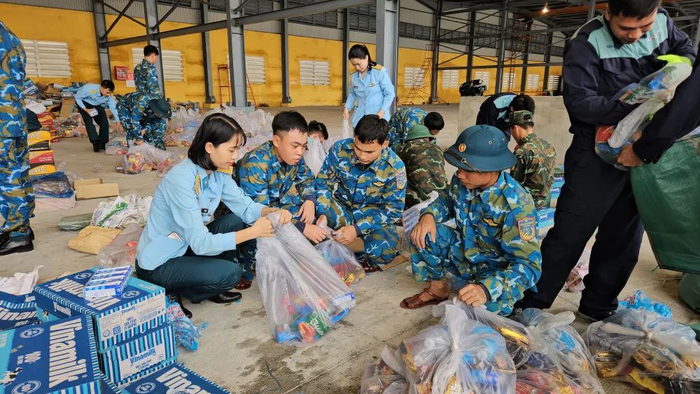 Cán bộ chiến sĩ sắp xếp hàng cứu trợ. Ảnh: TẤN VIỆT