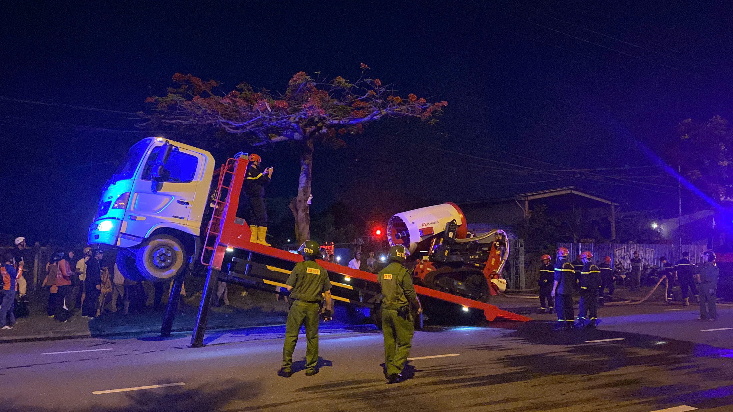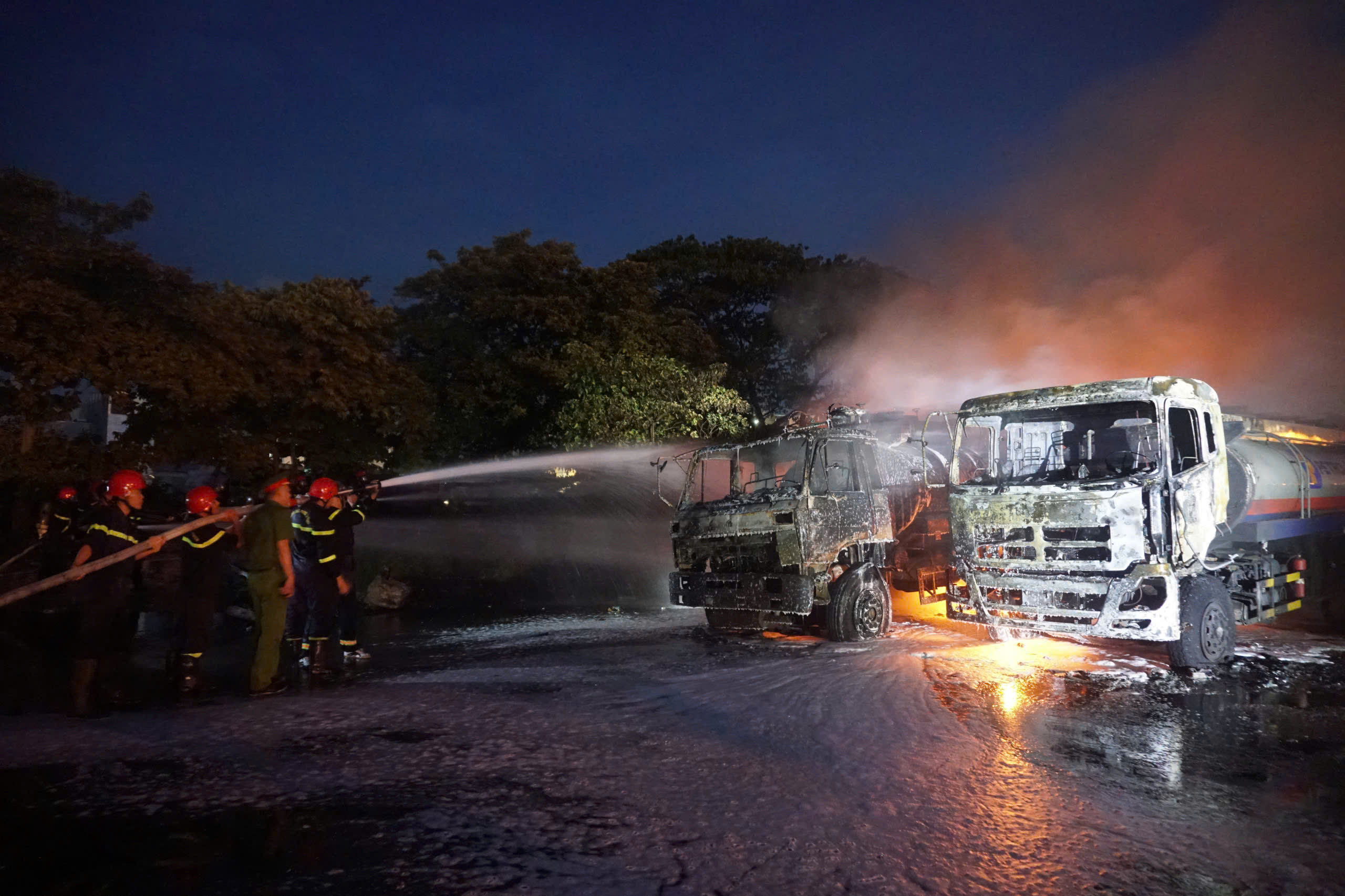 Tại hiện trường, ngọn lửa bao trùm 2 xe bồn chở xăng dầu và 1 thùng container bên trong chứa các phuy dầu, khói lửa bốc cao nghi ngút. Cảnh sát PCCC-CNCH đã sử dụng nhiều thiết bị chuyên dụng và bột chữa cháy để dập lửa, robot chữa cháy cũng được đưa đến hiện trường.