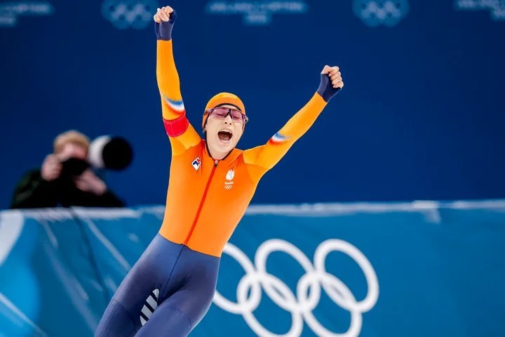 Vận động viên trượt băng tốc độ 500 mét người Hà Lan, Femke Kok, ăn mừng chiến thắng.