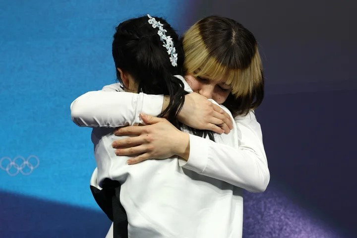 Vận động viên trượt băng nghệ thuật giành Huy chương Vàng của Mỹ, Alysa Liu, ăn mừng cùng với vận động viên giành Huy chương Đồng của Nhật Bản, Ami Nakai.