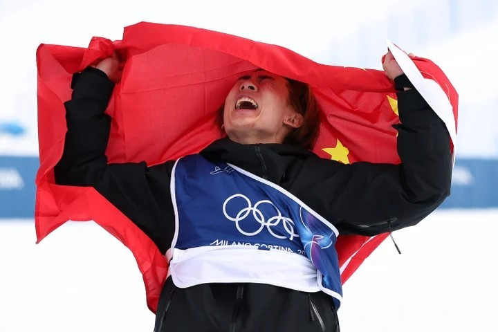 Vận động viên Su Yiming của Trung Quốc ăn mừng sau khi giành chiến thắng trong trận chung kết trượt băng nghệ thuật slopestyle nam.