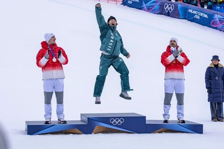 Vận động viên Lucas Pinheiro Braathen của Brazil nhảy cẫng lên vì vui sướng sau khi giành Huy chương Vàng ở nội dung trượt tuyết slalom khổng lồ nam.