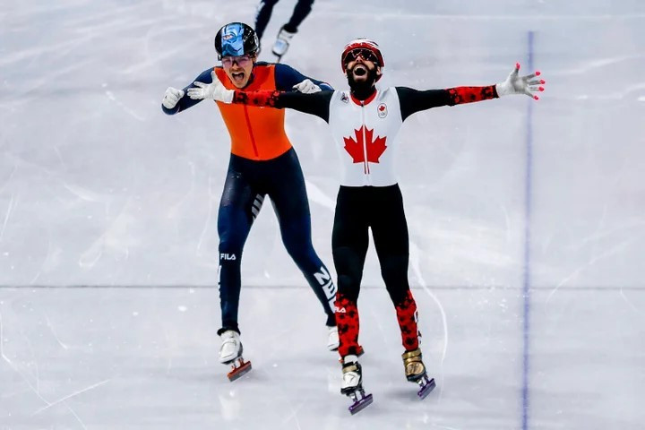 Steven Dubois của Canada ăn mừng sau khi hoàn thành nội dung trượt băng tốc độ cự ly ngắn 500 mét.